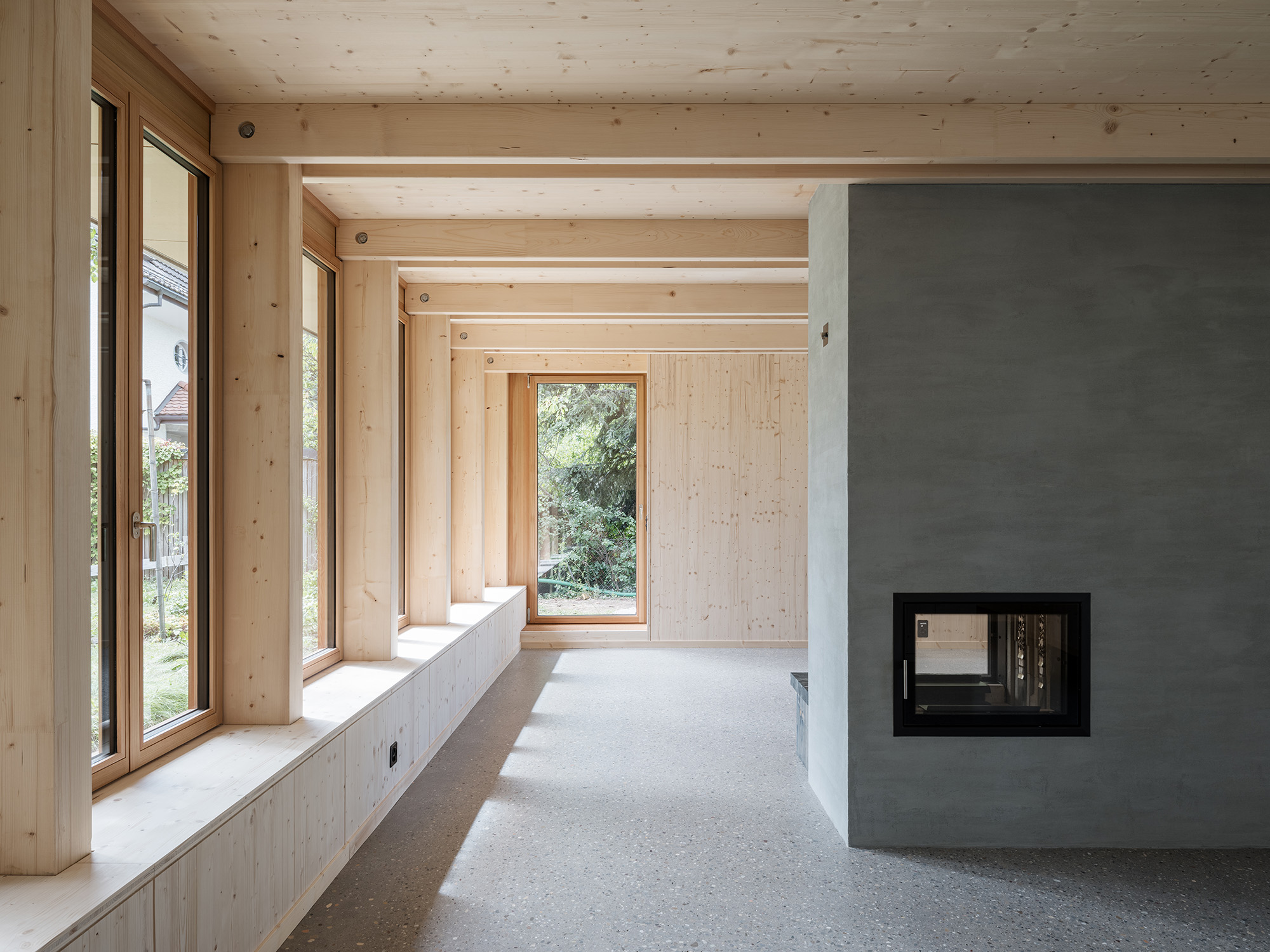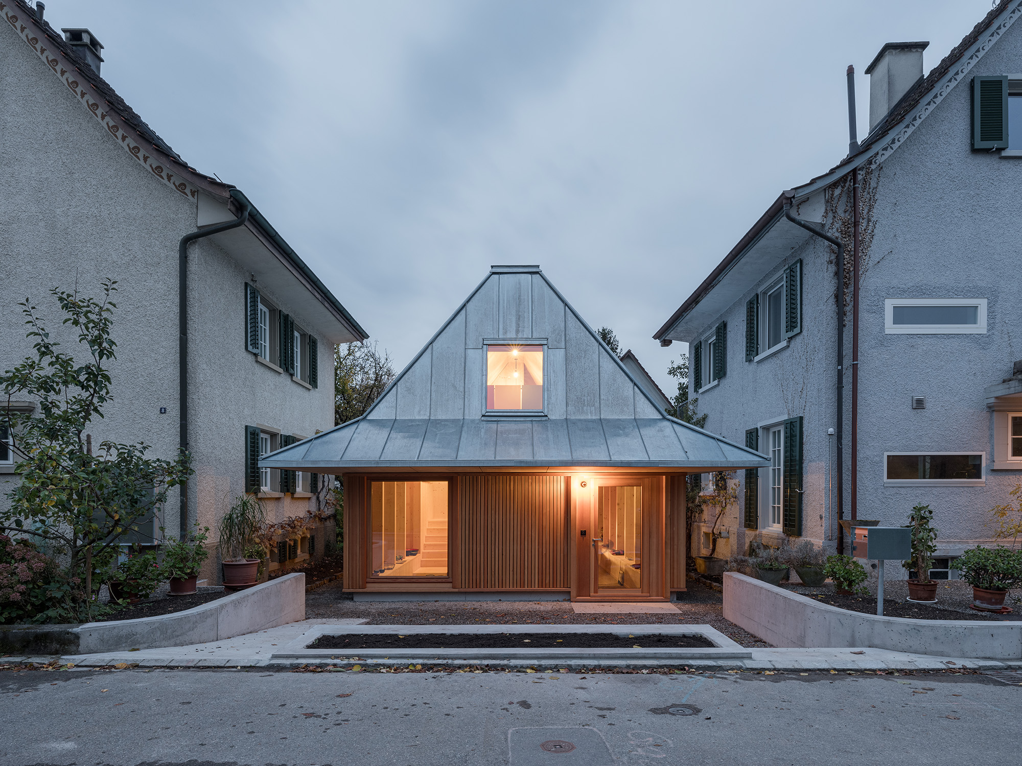 In einem ruhigen Wohnquartier in Uster wurde in den verbleibenden Raum zwischen zwei bestehenden Einfamilienhäusern ein kleines eingeschossiges Wohngebäude in Holz gesetzt. In diesem langgezogenen «Gartenhaus» wohnt die Bauherrschaft in engem Bezug zum umliegenden Grünraum.