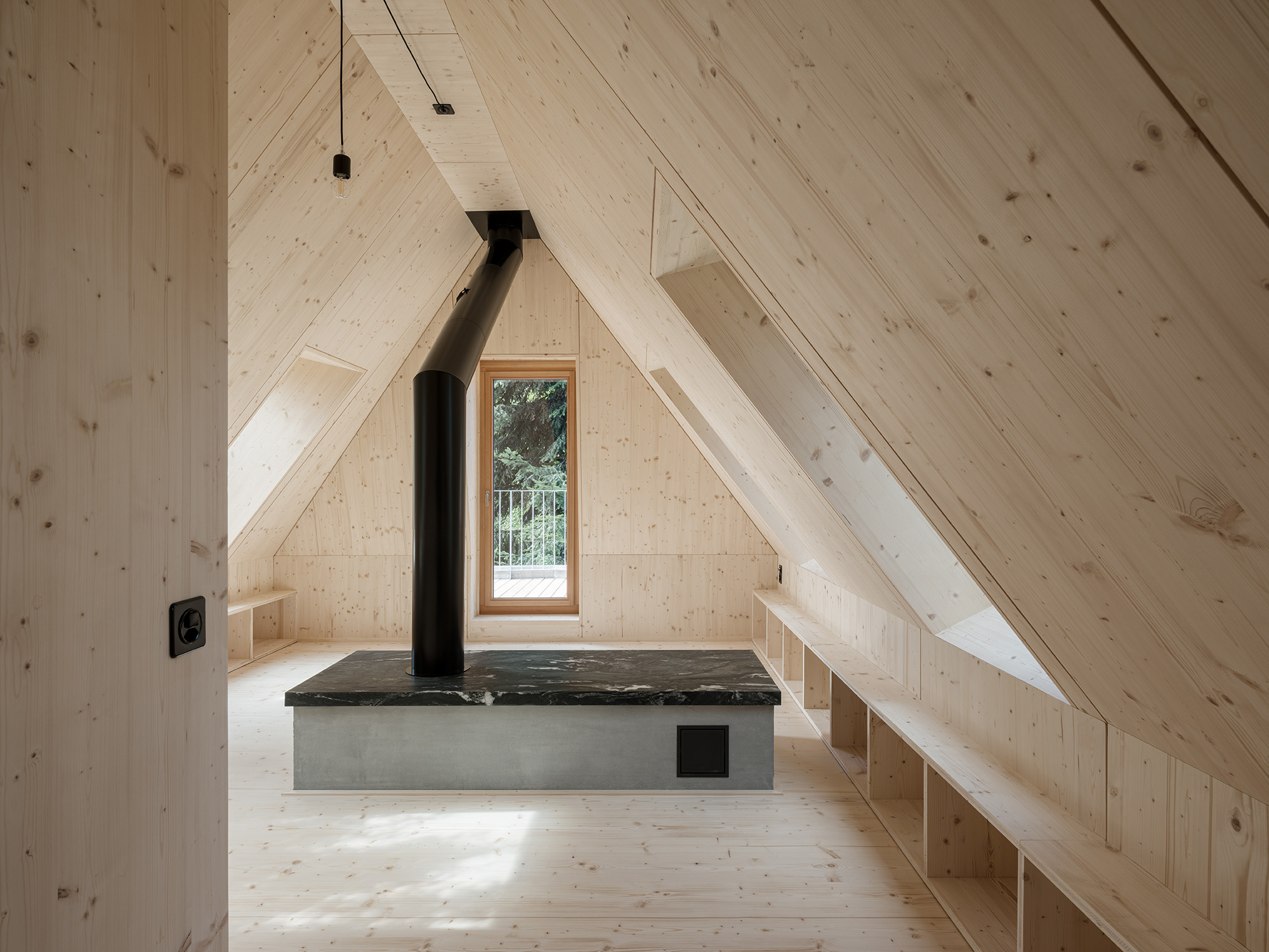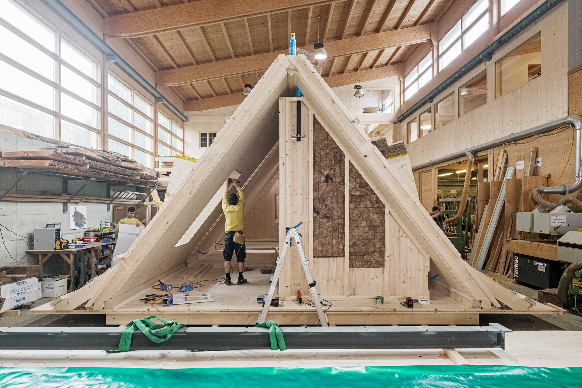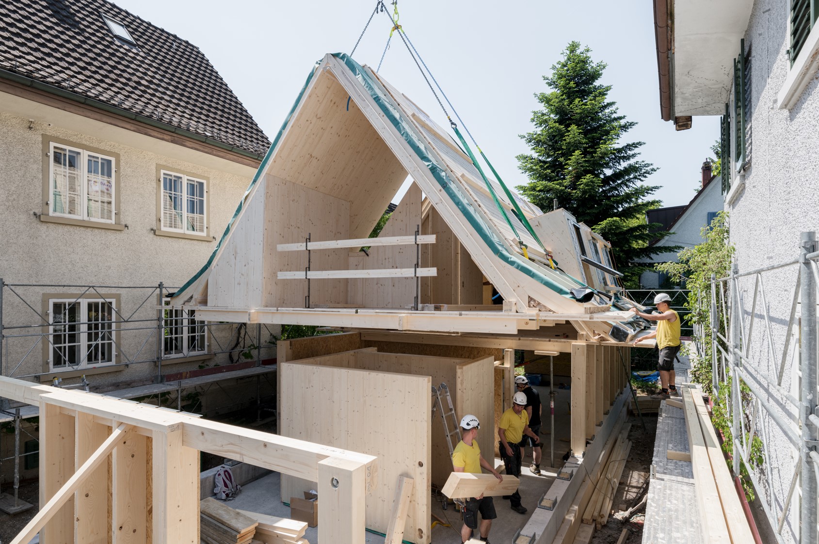 Die Holzstruktur des Dachraums wurde in sechs Modulen vorgefertigt. Diese konnten dank einer durchdachten Fügung direkt auf die Fassadenpfosten im Erdgeschoss abgesetzt werden, wo am Gelenkpunkt eine sichtbare Bauschraubenverbindung die Bauteile verbindet.