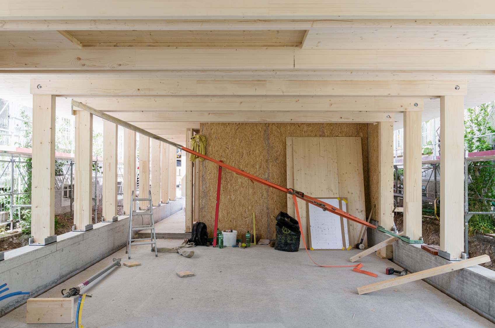 Der schmale Baukörper wird von einer schlanken Holzrippendecke überspannt. Die paarweise angeordneten Rippen wirken mit der darüberliegenden Dreischichtplatte als T-Träger. Vertikale Kräfte werden von den als Zangen wirkenden Rippenpaaren über eine Scherverbindung an die Fassadenpfosten weitergegeben.