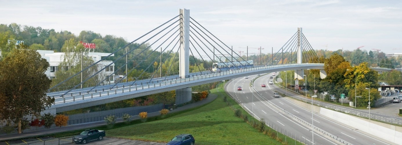 Als INGE AIR freuen wir uns, als Gesamtplaner mit der Projektierung des Los 1 einen wesentlichen Teil zu diesem Grossprojekt leisten zu dürfen. Das Los 1 umfasst die Strecke zwischen Haltestelle Flughafen und Haltestelle Obstgartenstrasse. Kernstück ist der Viadukt Obstgarten, welcher mit einer Mittelspannweite von 120 m die Autobahn überspannt. Aufgrund der zur Verfügung stehenden Konstruktionshöhe ist eine obenliegendes Konstruktion erforderlich. Eine zentrisch zwischen dem Glattalbahntrasse und der Velohauptverbindung angeordnete Seilebene bildet zusammen mit zwei Pylonen das raumprägende Tragwerk. Die totale Brückenlänge beträgt 440 m.