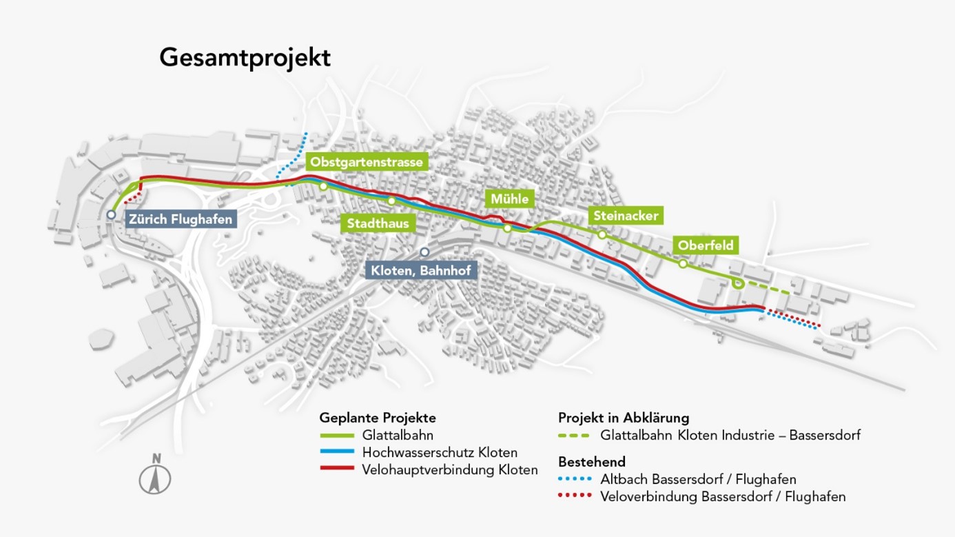 Neben der Glattalbahn wird im gleichen Korridor eine Velohauptverbindung geplant. Der bestehende Altbach wird aufgewertet und mit einem unterirdischen Stollen hochwassersicher gemacht.