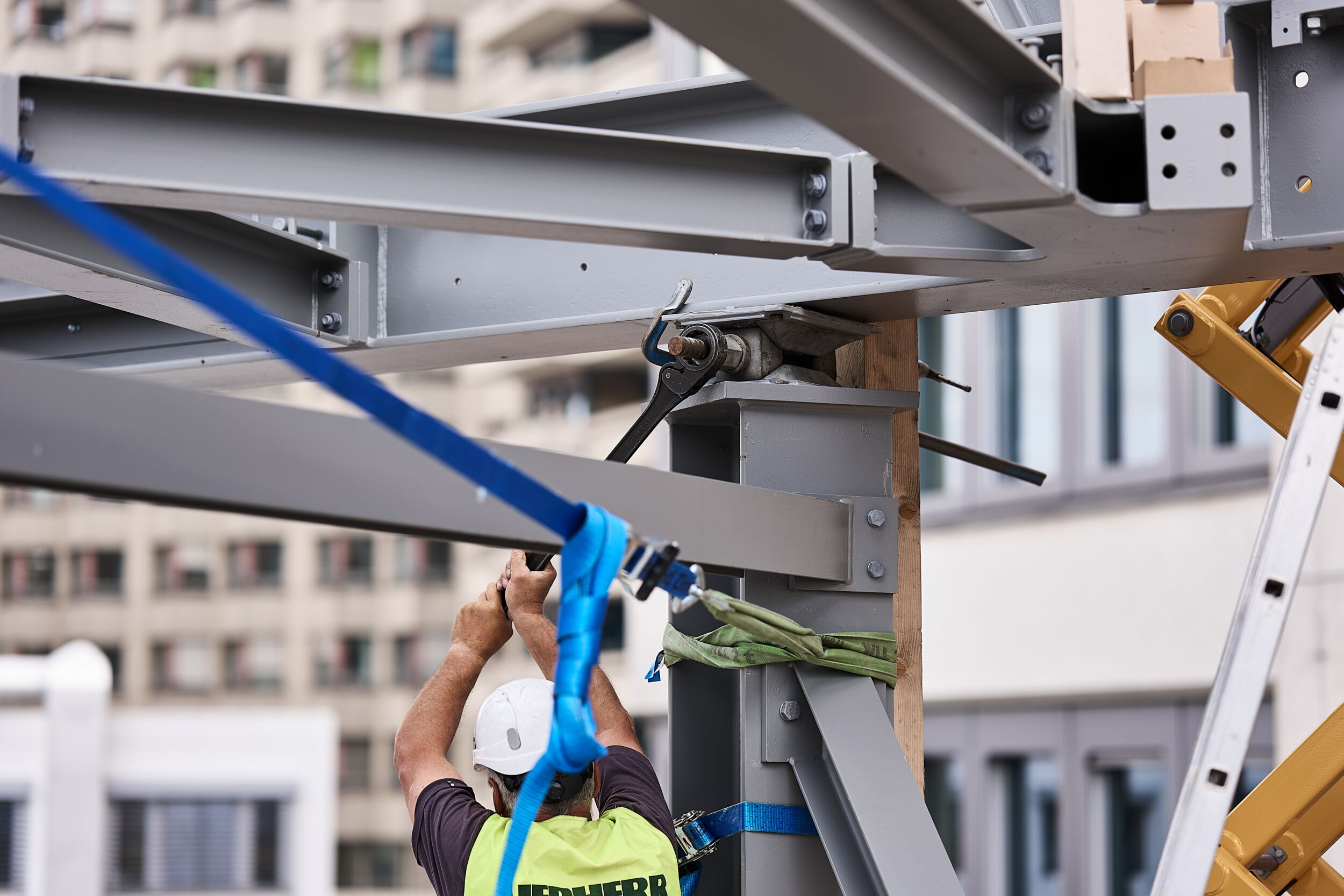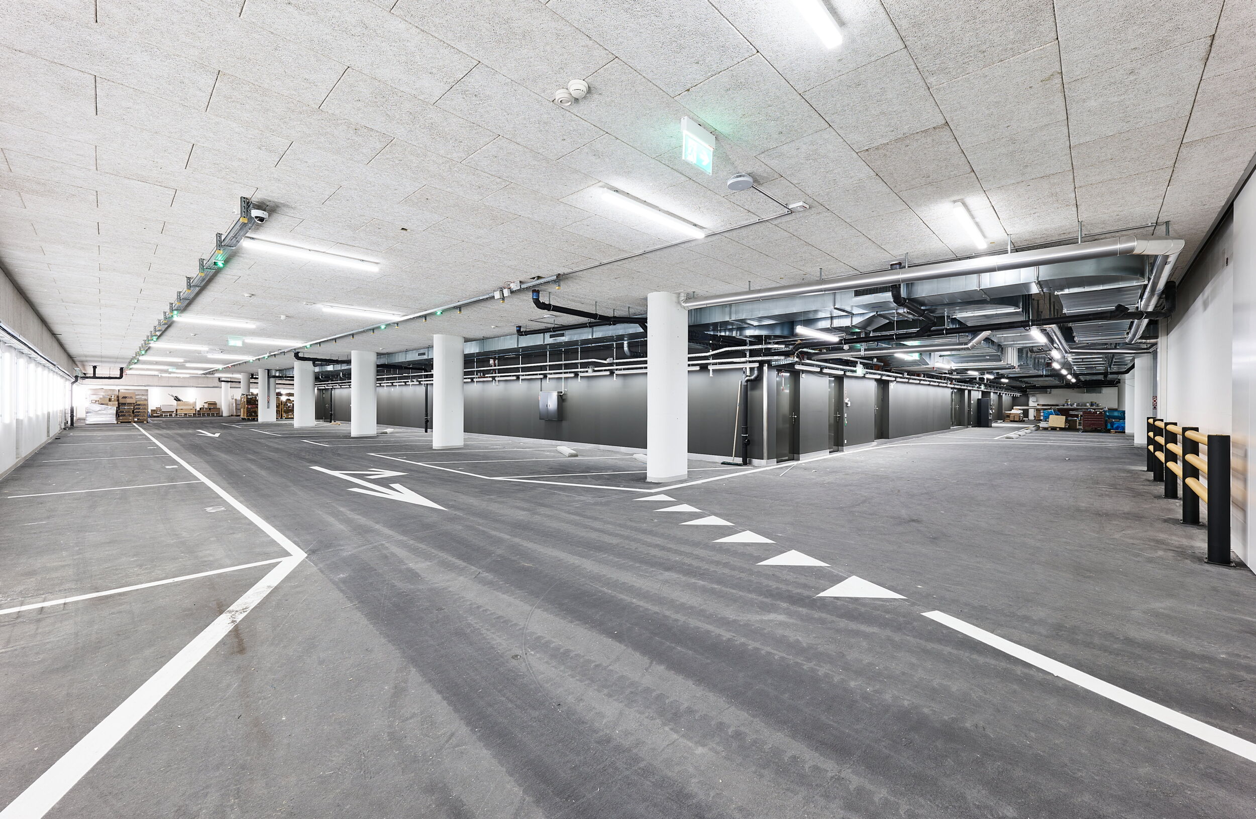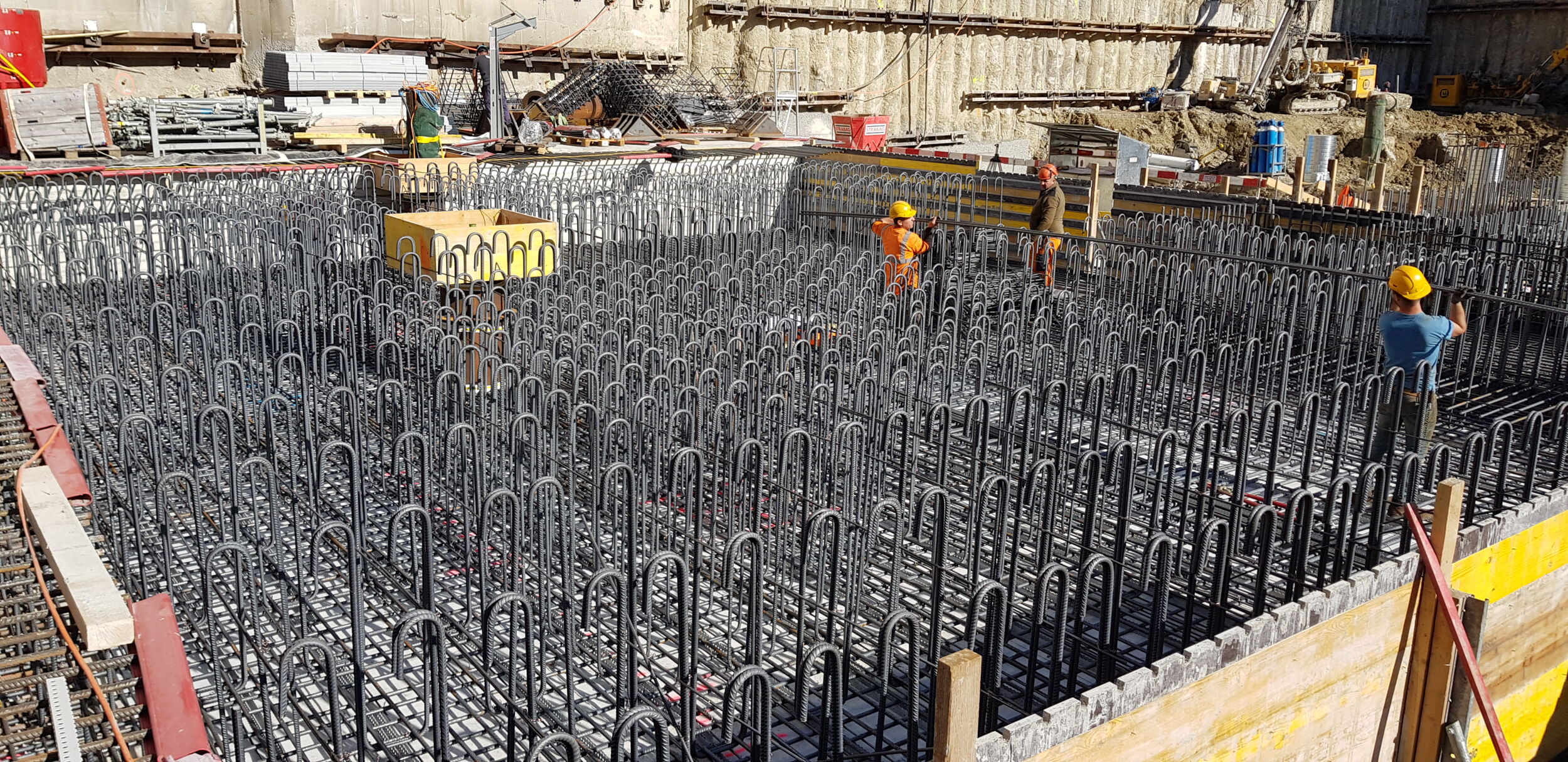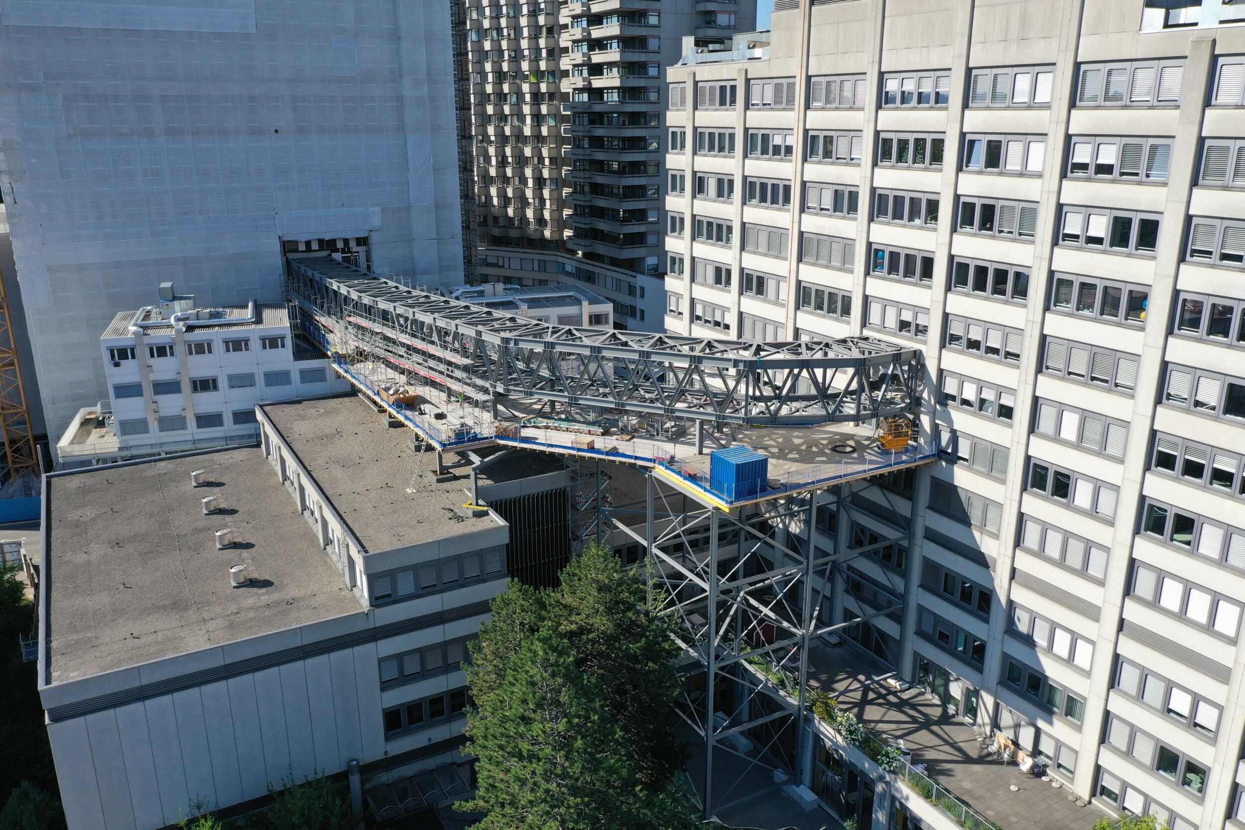 Skelettbau (2 UG, 16 OG, 70 m × 82 m × 63 m, Nutzfläche ca. 82'000 m2), Betonkubatur ca. 55'000 m3, davon ca. 13’000 m3 für die Bodenplatte, Kombinierte Pfahl-Platten-Gründung (KPP) mit 227 Pfählen, weitgespannte Passerellen als Fachwerkkonstruktion in Stahl |