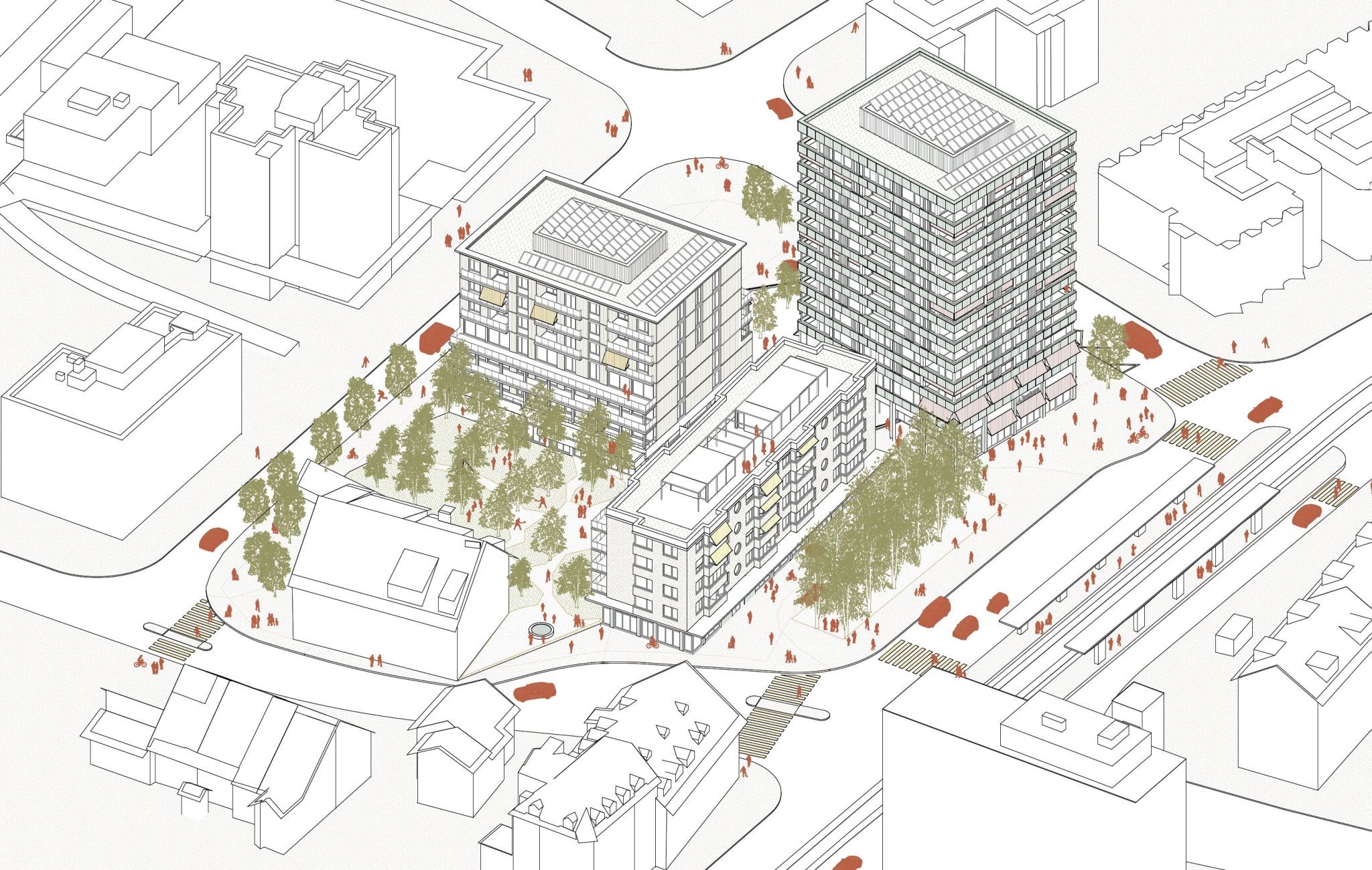 Direkt am Zehntenhausplatz soll das Zentrum des Quartiers durch drei Neubauten gestärkt werden. Das vorgeschlagene Projekt sieht drei Neubauten mit Gewerbenutzungen in den unteren Geschossen und Wohnraum in den oberen Geschossen vor.