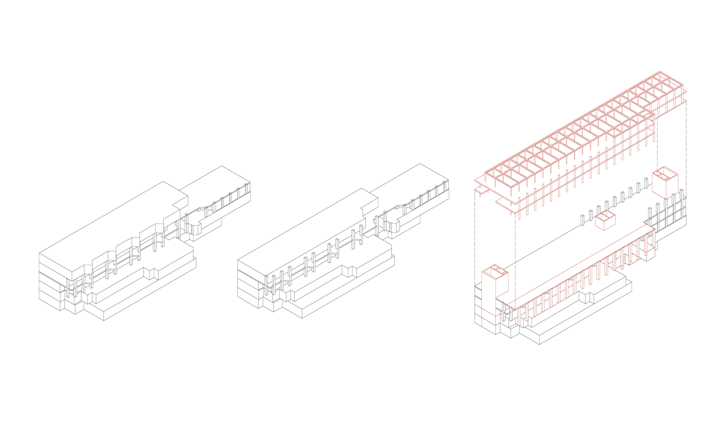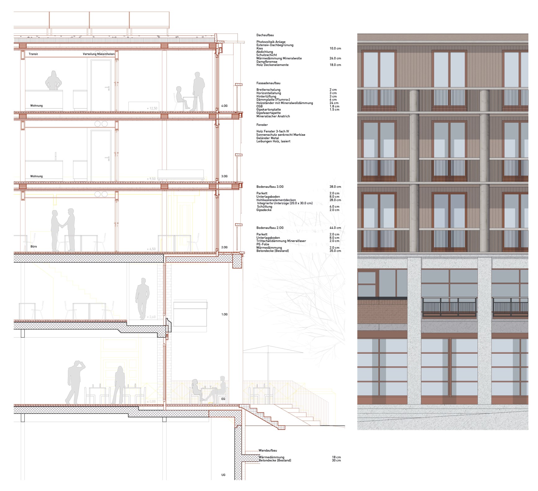 Der bestehende Baukörper des Bahnhofsgebäudes soll um drei Geschosse aufgestockt werden. Das Tragwerk der Aufstockung ist als Skelett in Holzbauweise konzipiert und ermöglicht eine hohe Flexibilität in der Grundrissgestaltung. Durch das kleine Gewicht des Holzbaus soll der Ertüchtigungsaufwand in der darunterliegenden bestehenden Struktur klein gehalten werden.