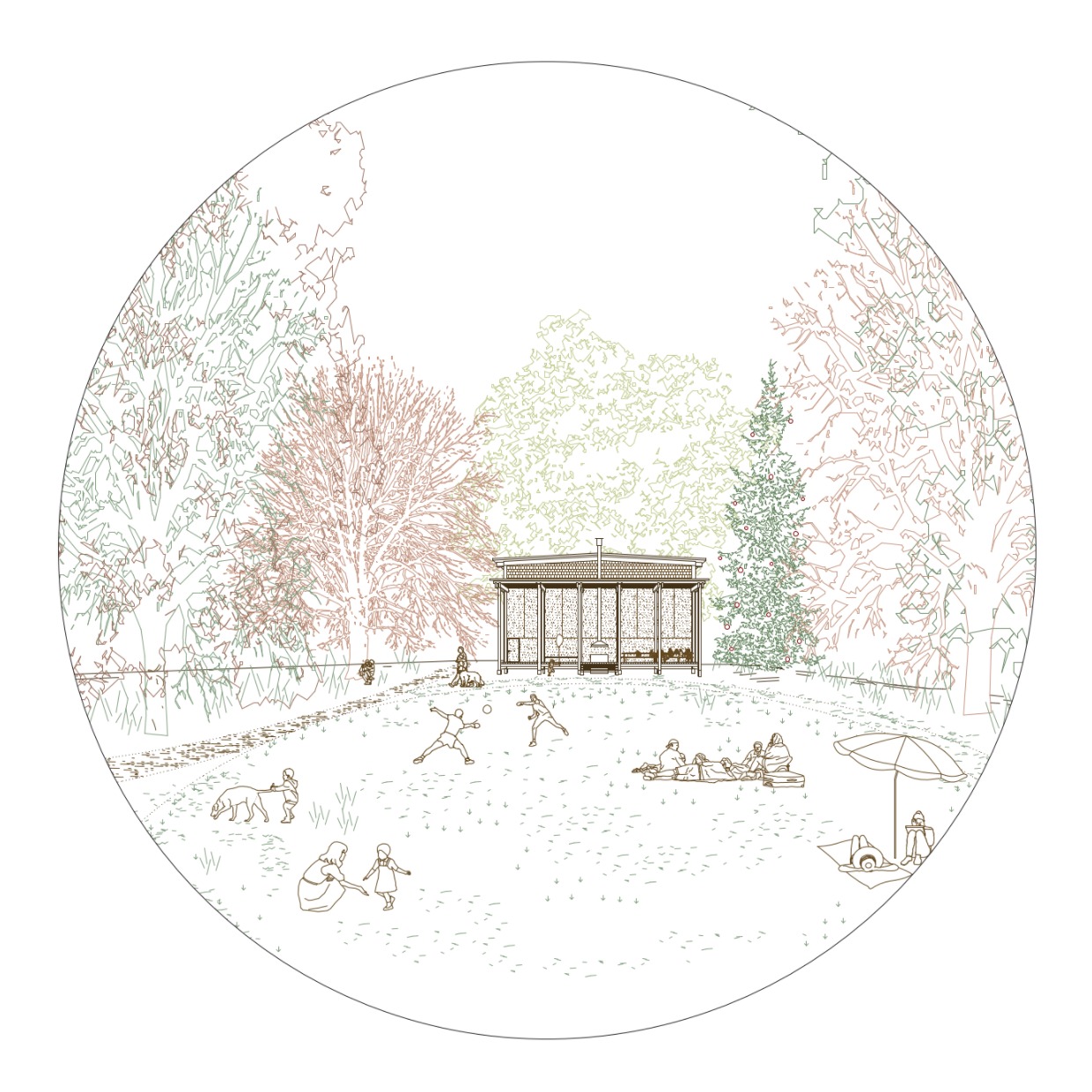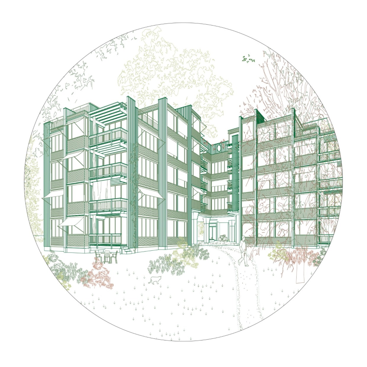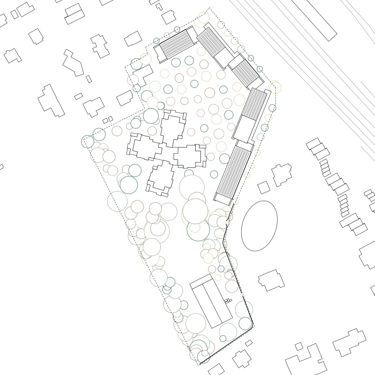 Das Projekt befindet sich auf einem naturnahen Areal mit einem grösseren Baumbestand südlich des Bahnhofs 🌳. Drei spannende Gebäudetypen - „Haus im Park“, „Haus im Obstgarten“ und „Haus in der Lichtung“ – fügen sich respektvoll in die Landschaft ein.