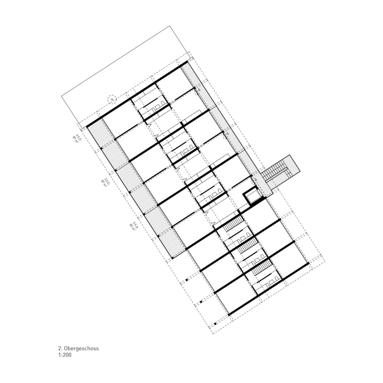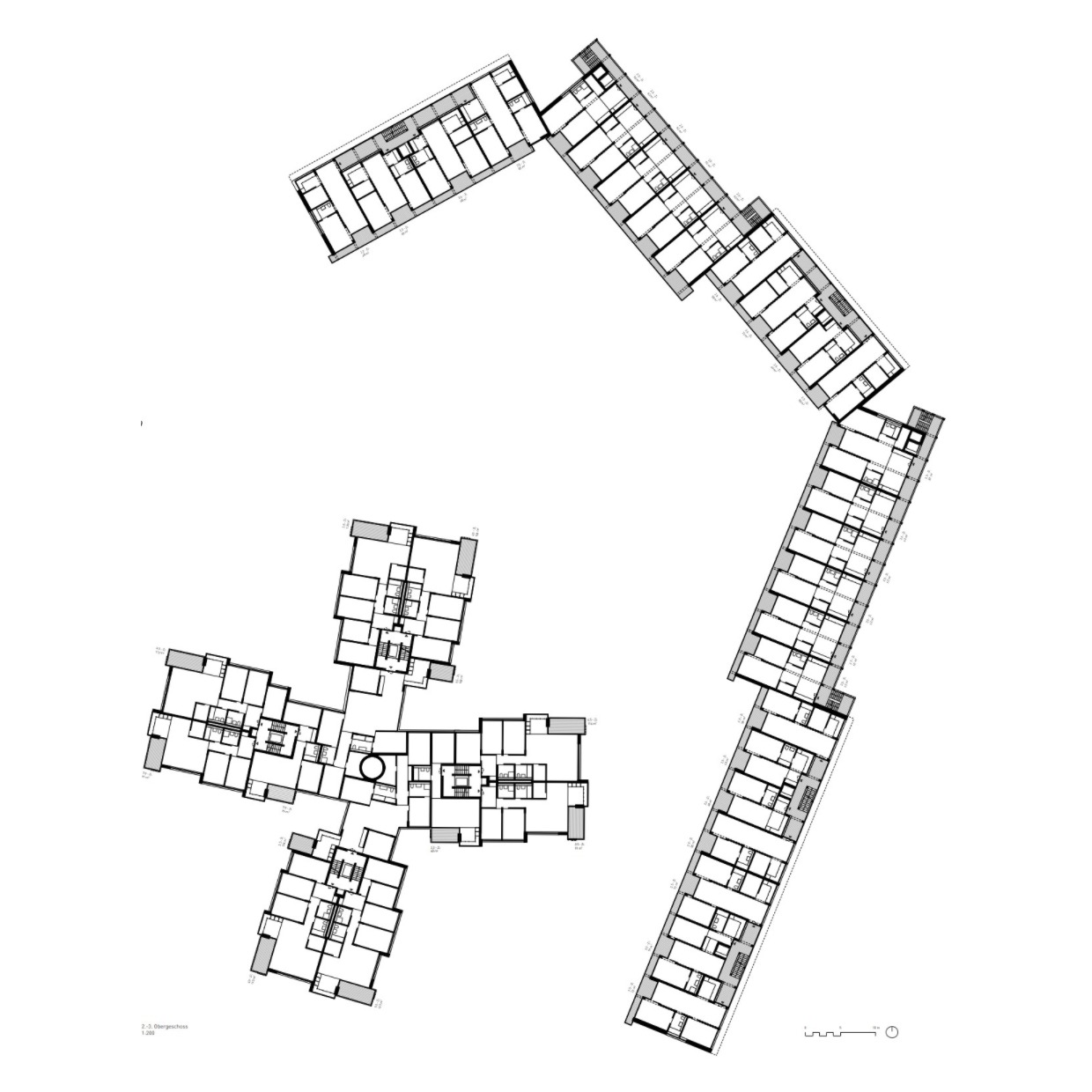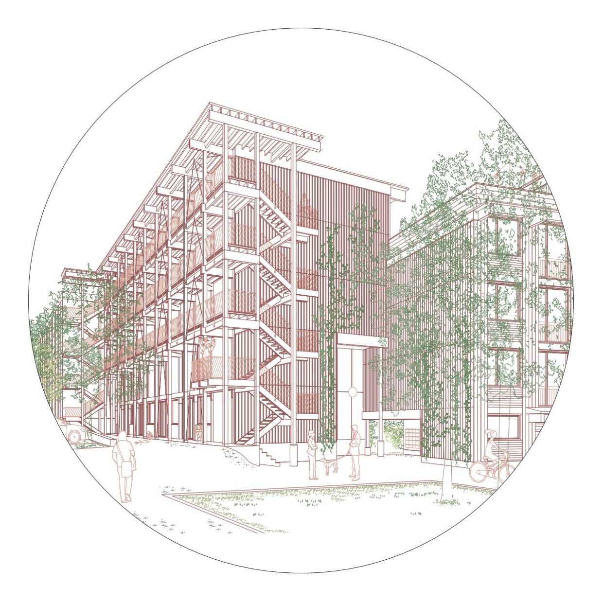 Jeder Gebäudetyp hat ein massgeschneidertes Tragwerkskonzept: Die langgezogene Häuserzeile am Obstgarten als präzise gefügter Holzbau mit Brettsperrholzdecken, die von Wänden und Unterzügen getragen werden. Das kleinere Haus in der Lichtung ebenfalls als Holzbau mit zangenartigen Doppelunterzügen und das Haus im Park als flexibel nutzbarer Skelettbau mit dünnen Betondecken und tragenden Holzstützen.