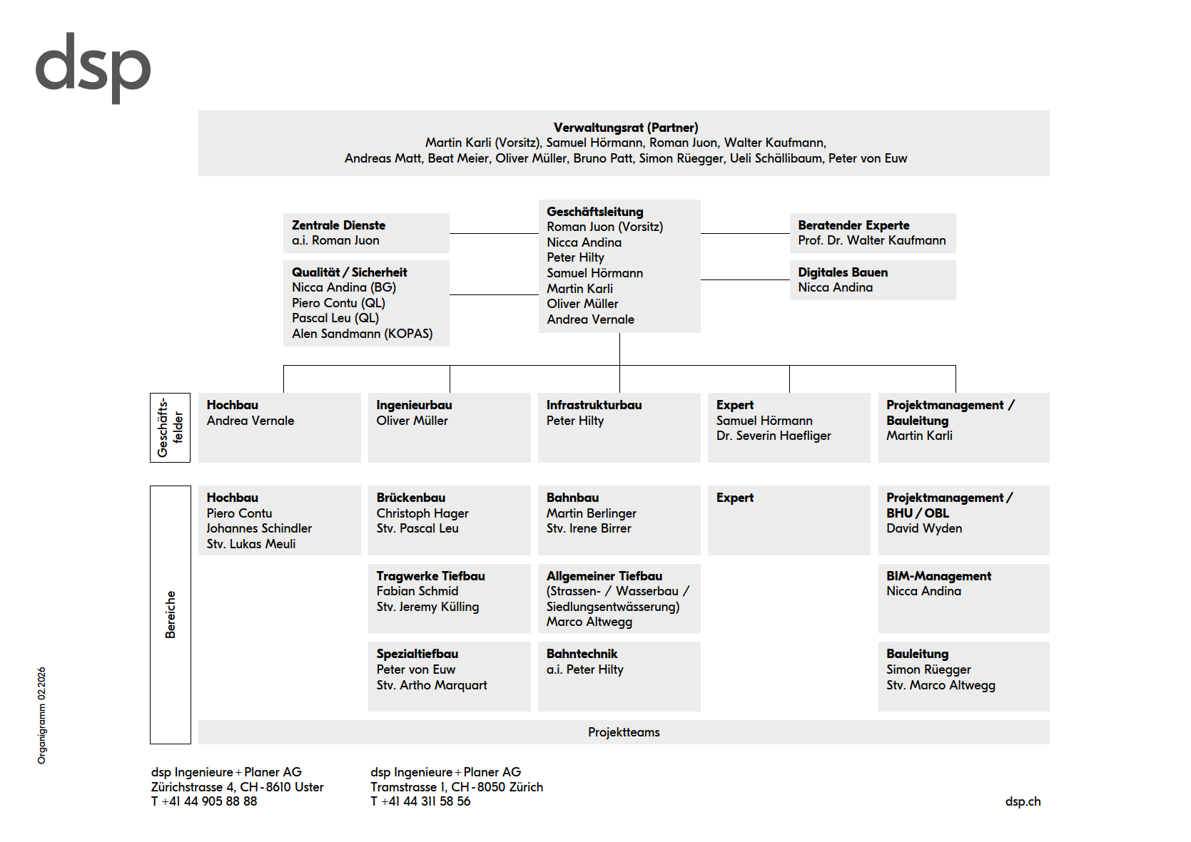 dsp Ingenieure + Planer AG ist seit 1985 als unabhängiges Ingenieur- und Planungsunternehmen in der Bauwirtschaft erfolgreich in der ganzen Schweiz und im Bereich der Kernkompetenzen auch international tätig. Die auf hohe Qualität und Kundenorientierung ausgerichteten Dienstleistungen umfassen den gesamten Planungsprozess von der Konzeptphase bis zur Inbetriebnahme. Die Firma ist im Besitz der leitenden Mitarbeitenden.