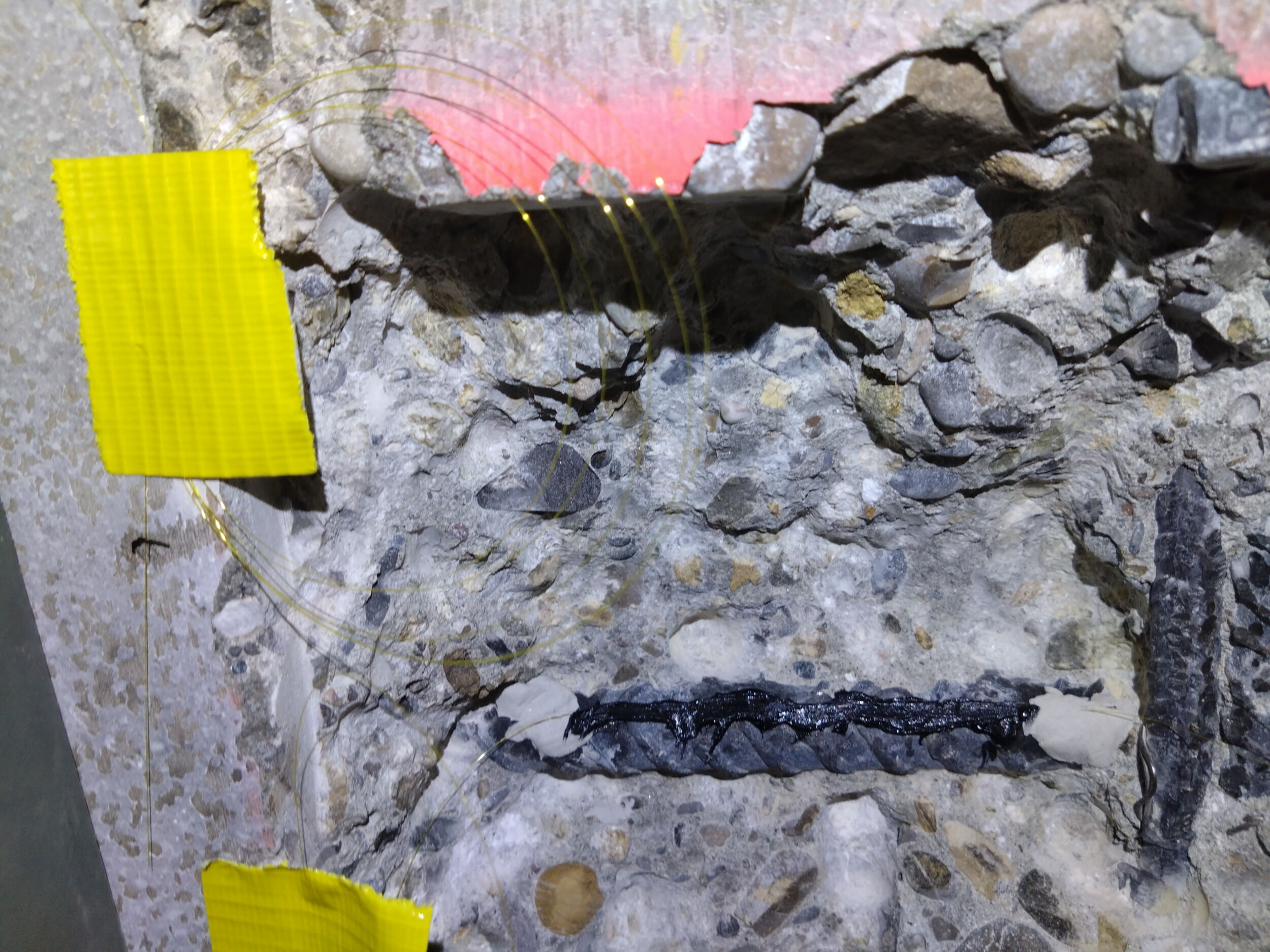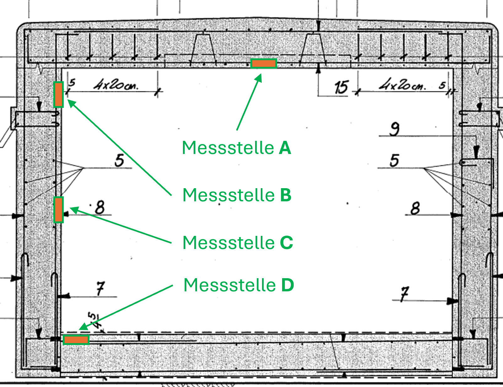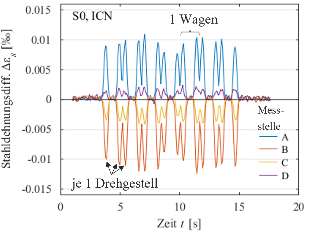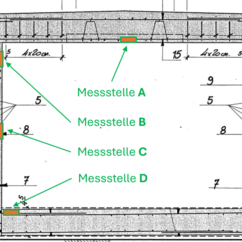 Die Messungen wurden mittels eines faseroptischen Dehnungsmesssystems der ETH Zürich durchgeführt, wozu die Bewehrung an verschiedenen Stellen über eine kurze Länge freigelegt und mit Glasfasern ausgestattet wurde. Ihre Dehnung konnte so für die Durchfahrt verschiedener Zugkompositionen bestimmt werden.