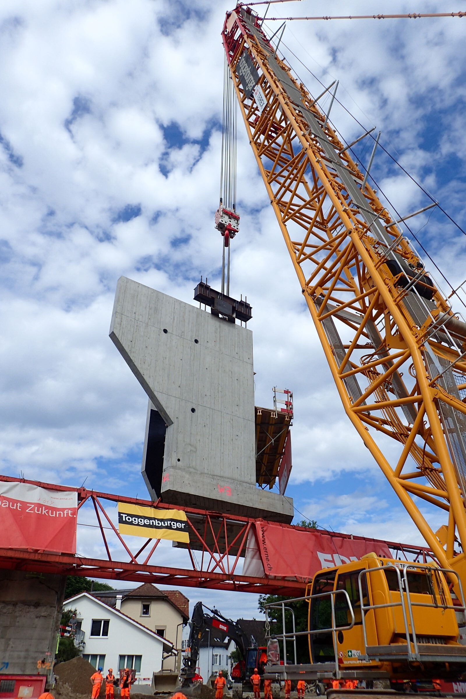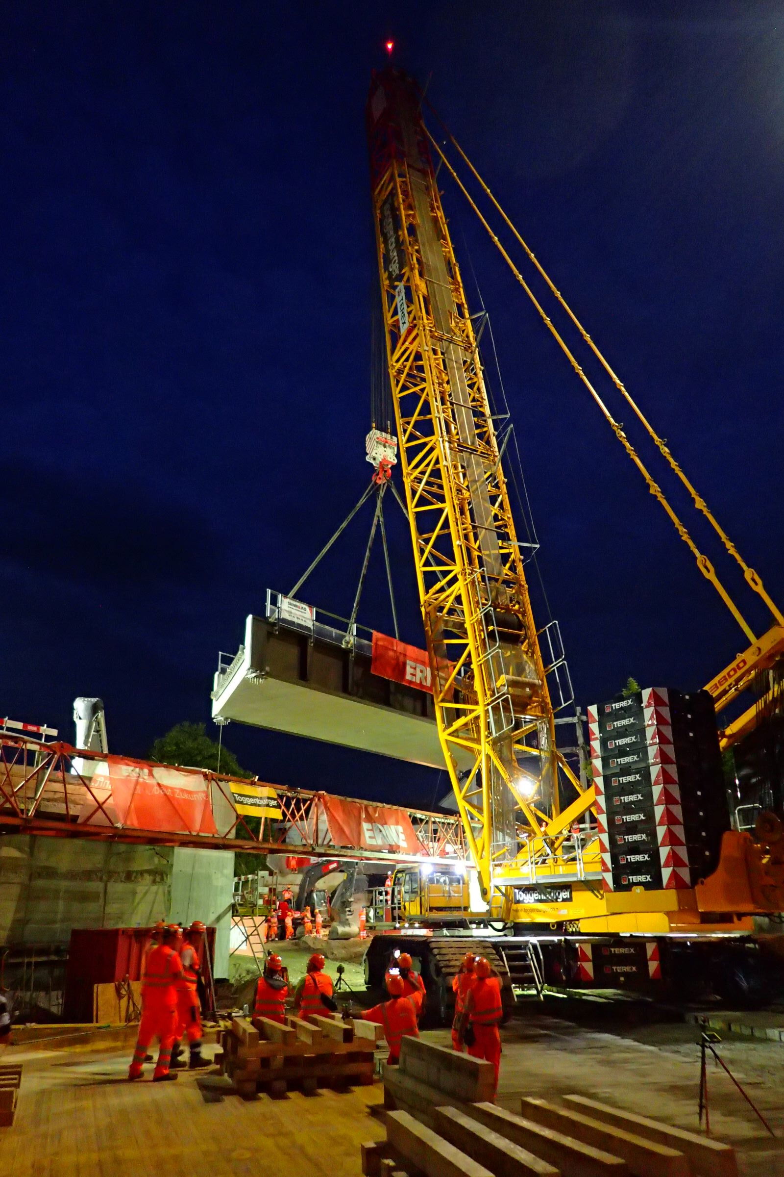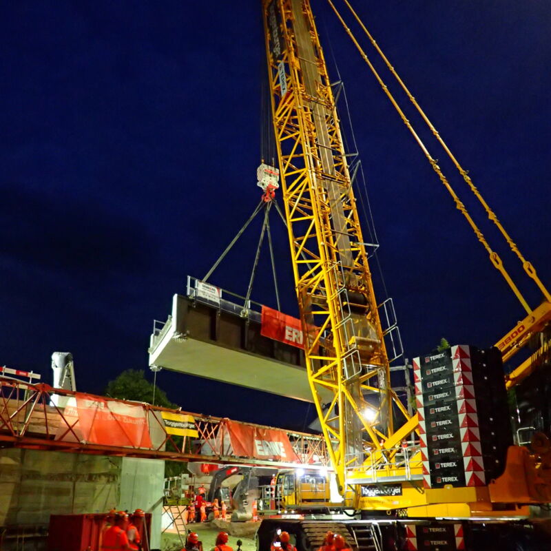 Um den betrieblichen Unterbruch der Bahnstrecke zu minimieren, wurden Widerlager und Überbau zunächst getrennt neben der alten Brücke hergestellt. Während einer 52 h dauernden Sperrung wurde das Bestandsbauwerk abgebrochen sowie nacheinander mit einem Raupenkran die beiden neuen Widerlager (je ca. 230 t) und der Überbau (ca. 250 t) eingehoben. Anschliessend erfolgten als Fertigstellungsarbeiten die Einbringung der Hinterfüllung, der Einbau des Schotters und die Montage der Fahrleitungen.