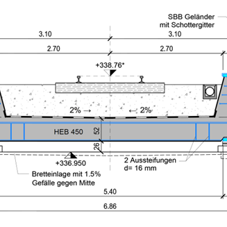 Neben der Bahnbrücke wurde ergänzend eine neue Fussgängerpasserelle (inkl. Widerlager) eingehoben, deren schiefer Stahlüberbau eine Gesamtlänge von rund 25 m hat. In Verlängerung der Brücke sind beidseitig Stützmauern mit Längen von rund 26 m und 31 m erforderlich, um die in den Bahndamm einschneidenden Zugangsrampen zu sichern. Aufgrund der Gleisnähe waren im Bauzustand der Passerelle und der Stützbauwerke diverse Sicherungsmassnahmen und entsprechende statische Detailnachweise erforderlich.