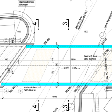 Im Rahmen des Projekts Ortsumfahrung Bad Zurzach wurde der Ersatz der Bahnbrücke im Ortszentrum aufgrund der Verbreiterung der darunter liegenden Strasse erforderlich. Der Überbau der neuen Brücke besteht aus einem Trog in Verbundbauweise mit einer Spannweite von rund 17 m und einer Schiefe von ca. 55°.