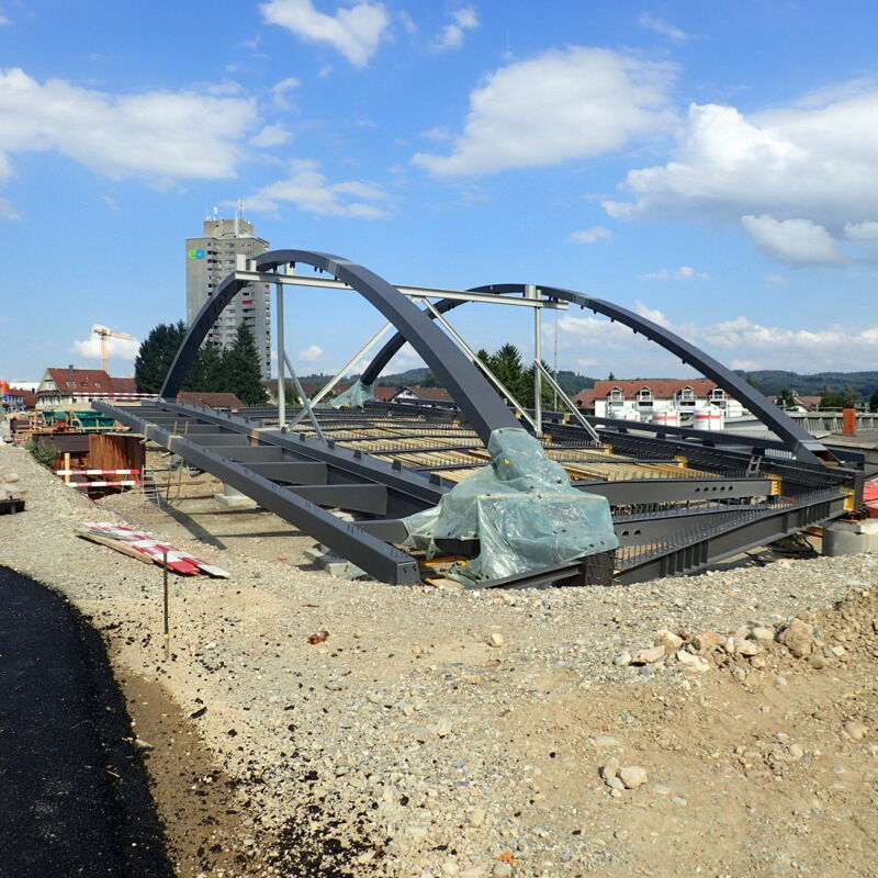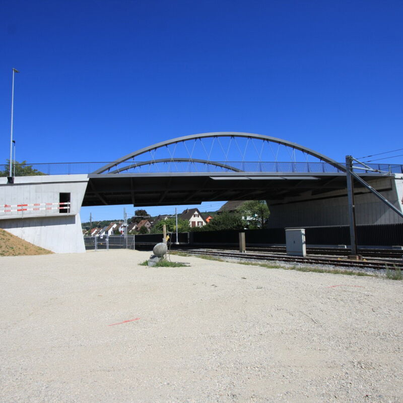 Die Fahrbahn zwischen den Bögen ist in Verbundbauweise mittels einer Ortbetonplatte auf den Stahlquerträgern ausgeführt. Auf beiden Überbauseiten schliessen ausserhalb der Bögen um rund 3 m auskragende Fuss-/ Radwege an. Der Unterbau besteht aus pfahlfundierten Widerlagern, die in der Verlängerung der Brücke als monolithisch angeschlossene Stützmauern weitergeführt sind. Da die Überquerung der SBB-Strecke während der Bauzeit unter vollem Betrieb bleiben musste, wurde die neue Brücke zunächst neben dem bestehenden Bauwerk erstellt und konnte somit in der Bauphase als Hilfsbrücke für den Rückbau der alten Brücke genutzt werden. Zu diesem Zweck wurden in dieser temporären Lage provisorische Widerlager erstellt, auf die der neue Überbau längs eingeschoben wurde. Der Einschub erfolgte mittels zweier temporärer Zwischenabstützungen und eines kurzen Vorbauschnabels.