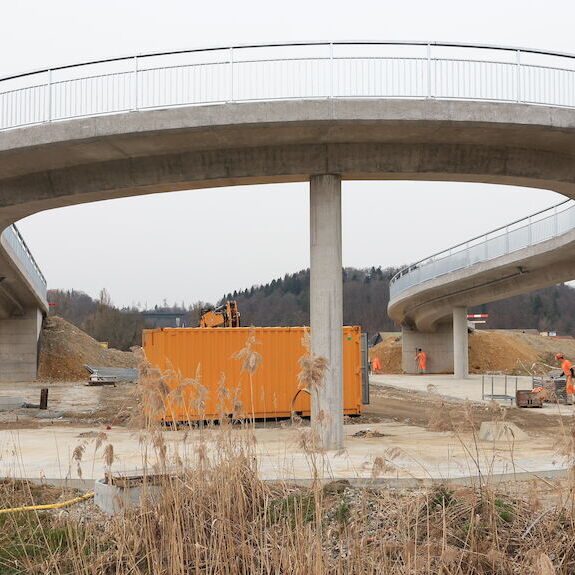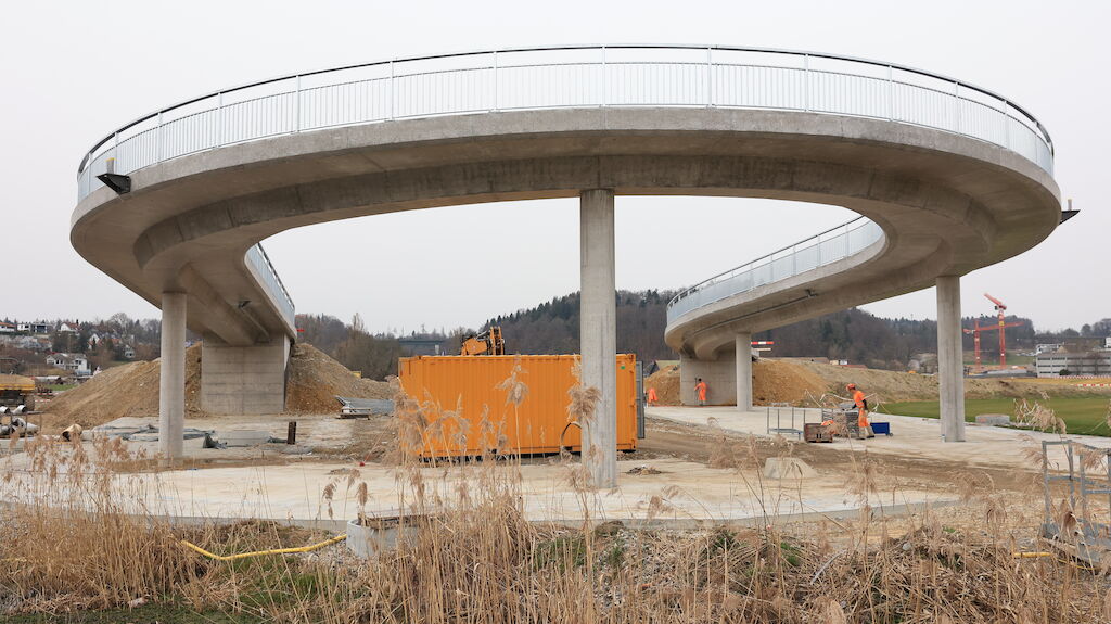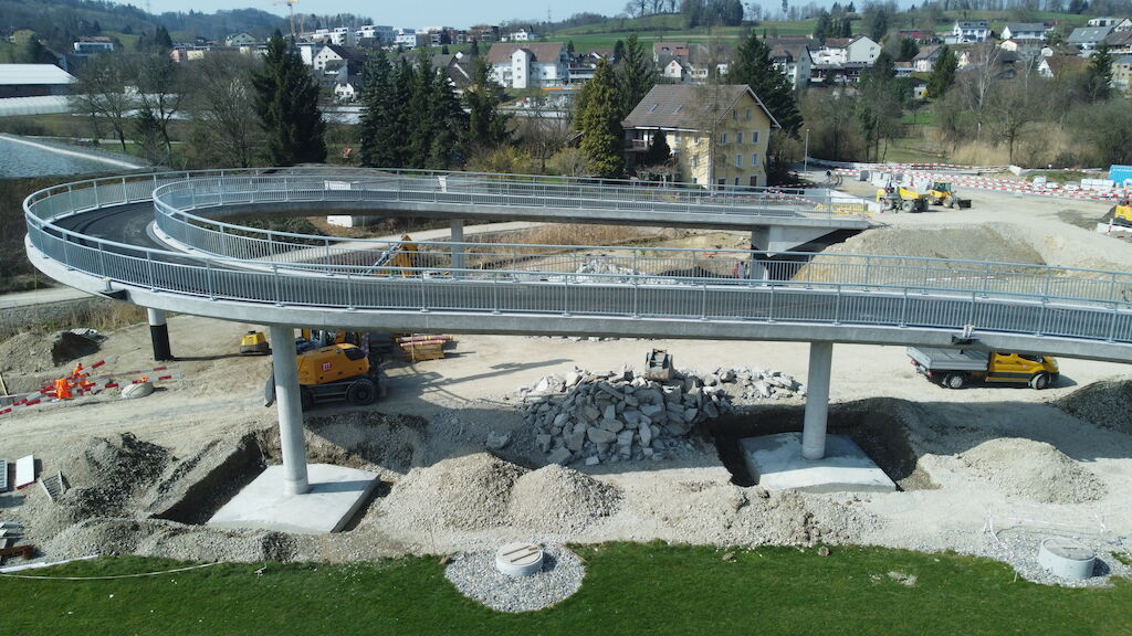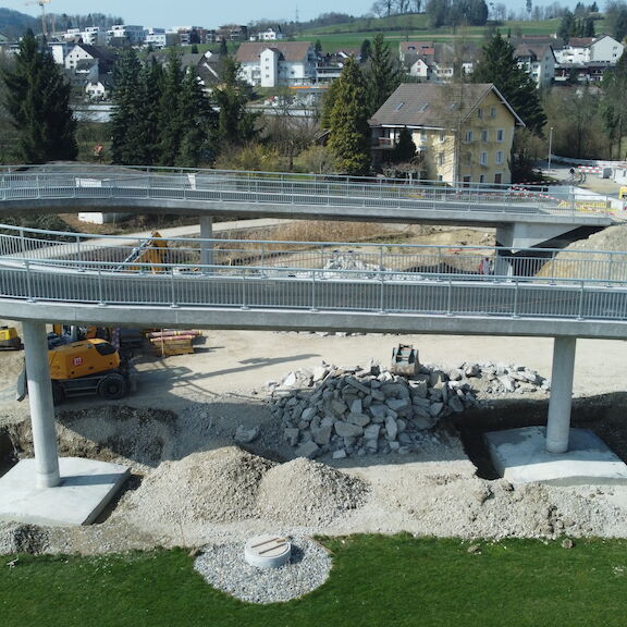Im Rahmen des Projekts Umfahrung Mellingen wurde unter anderem die Überführung Büblikerweg über die neue Kantonsstrasse NK 268 erstellt. Die Rad-/ Gehwegbrücke mit einer abgewickelten Gesamtlänge von 88.2 m wurde als schlaff armiertes Stahlbetonbauwerk konzipiert. Alle vier Stützen (Ø 70 cm) sowie beide Widerlager sind flach fundiert.