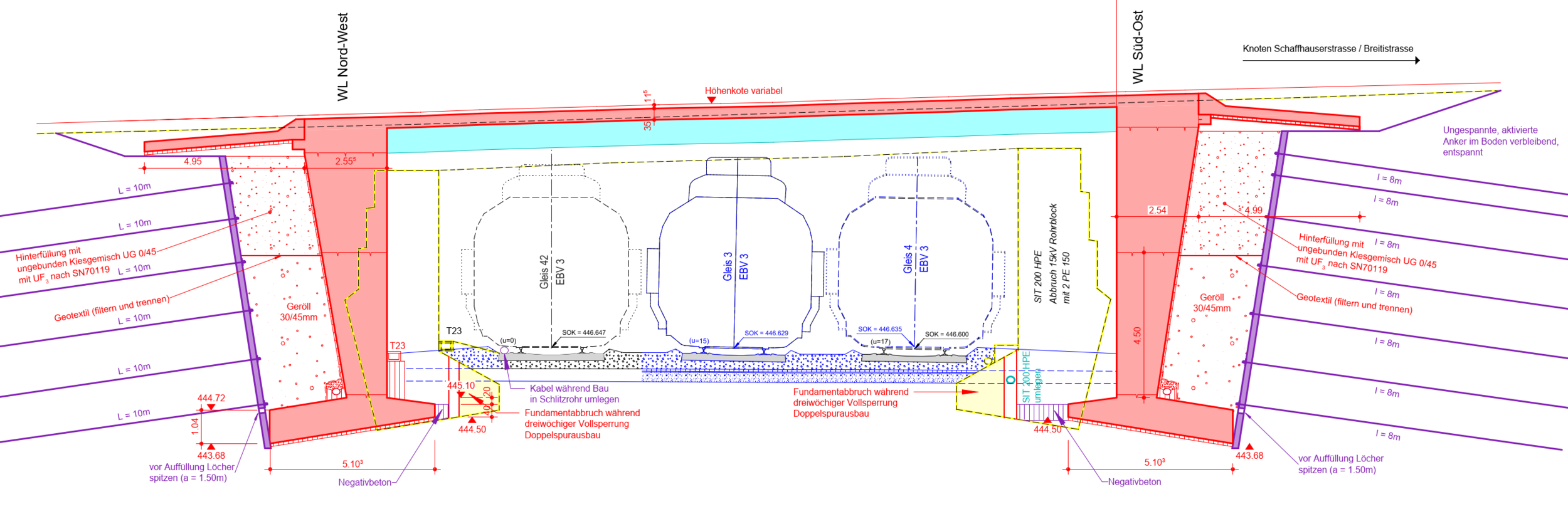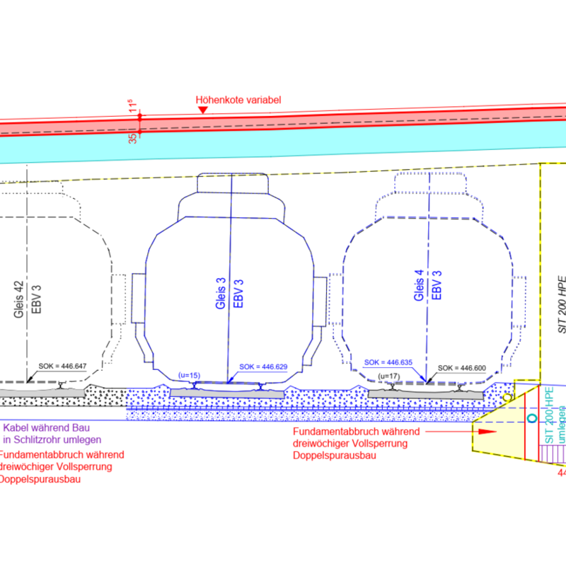 Neben dem Brückenersatz und den beiden Hilfsbrücken beinhaltet das Projekt auch grosse Baugruben und Stützmauern, da sich der betreffende Streckenabschnitt in einem Einschnitt befindet.