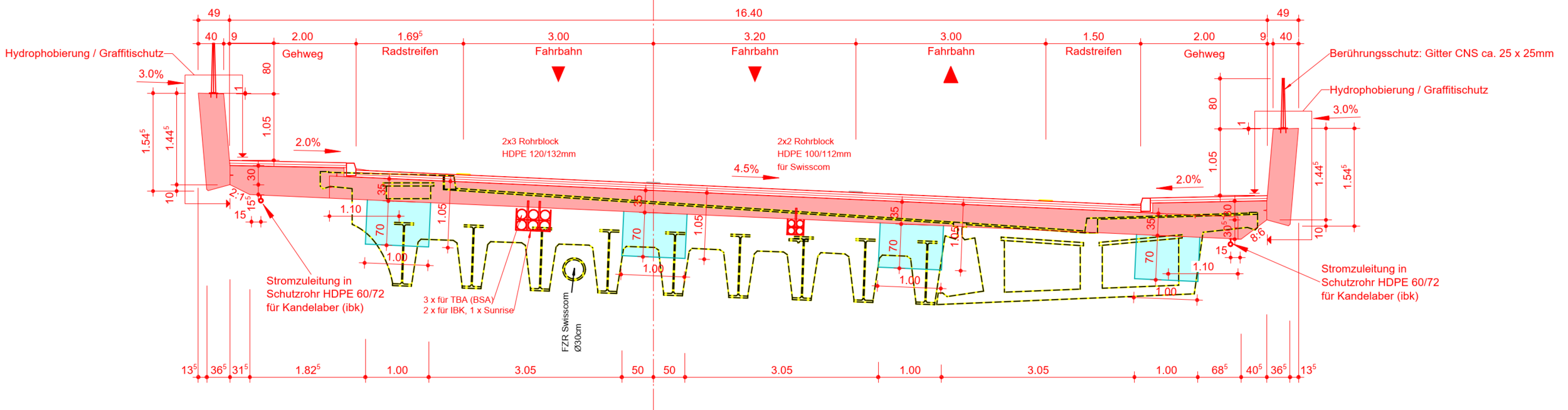 Der Neubau besteht aus einer einfeldrigen, schiefen Rahmenbrücke. Vier Stahlträger aus wetterfestem Stahl bilden im Verbund mit der Fahrbahnplatte aus Ortbeton den Überbau. Die Stahlträger und die Fahrbahnplatte werden monolithisch mit den Widerlagerwänden verbunden, sodass im Endzustand eine integrale Rahmenkonstruktion entsteht.