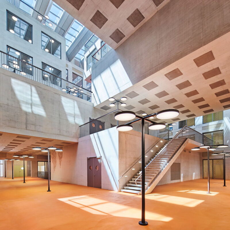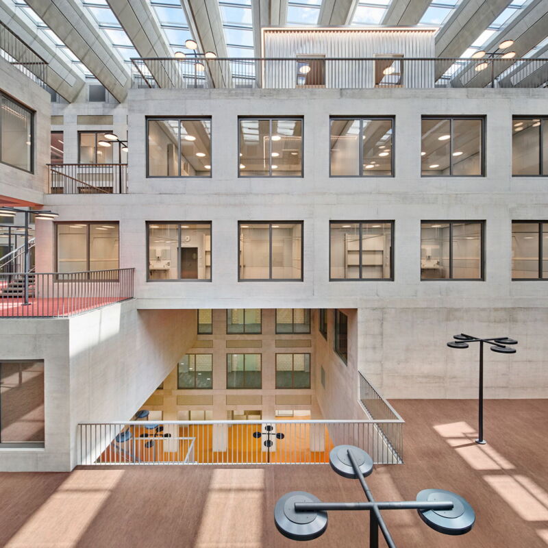 Ein Ring mit einer einbündigen Erschliessung begrenzt dabei den Innenhof. Vier vertikale Treppenhäuser ermöglichen eine rationale Erschliessung und eine einfache Orientierung innerhalb des Gebäudes. Die einbündige Erschliessung des Ringes wird über den Innenhof belichtet. Alle Wände innerhalb des Ringes können als nicht-tragende Raumabschlüsse erstellt werden. Dies ermöglicht eine hohe Flexibilität, so dass auch in Zukunft Anpassungen am Raumprogramm vorgenommen werden können. Die Hörsäle sowie die Praxisräume werden im Innenhof versetzt angeordnet. Durch dieses Prinzip entstehen vorgelagerte Terrassen welche als Foyer für die Hörsäle, zum Selbststudium oder als Aufenthaltsflächen dienen. Durch die versetzte Stapelung wird die Innenwelt horizontal und vertikal gegliedert.