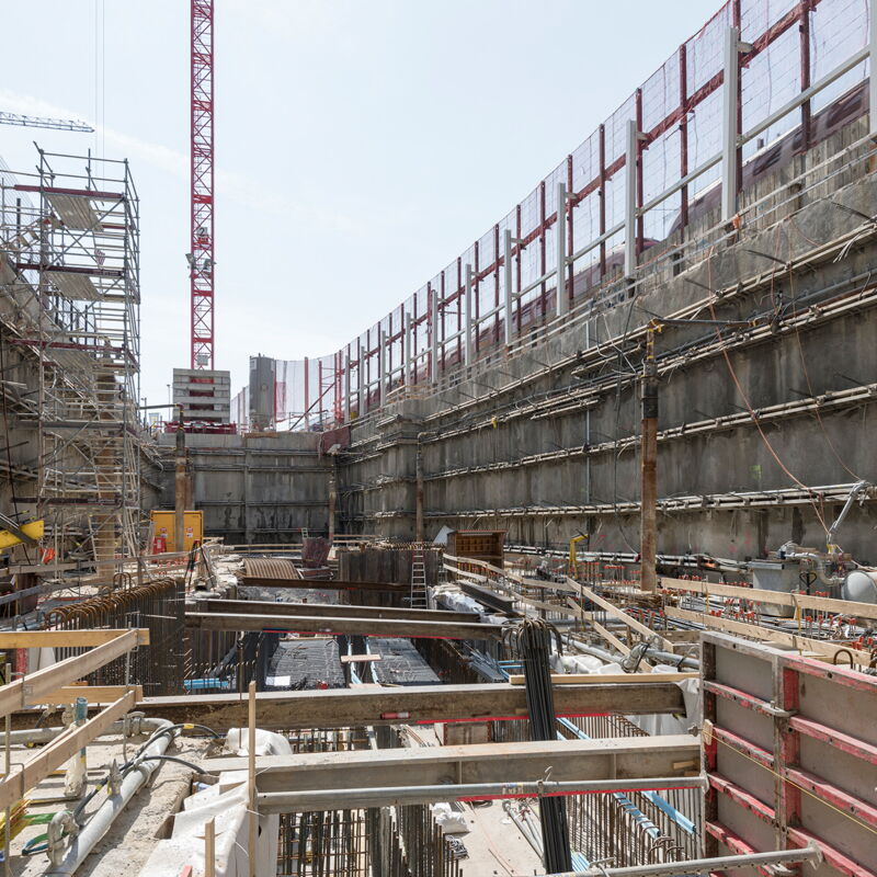 Die Baugrube, welche direkt an das Gleisfeld angrenzt, wurde dreiseitig mittels einer mehrfach rückverankerten überschnittenen Bohrpfahlwand realisiert. Richtung Bahnhof Oerlikon wurde der Baugrubenabschluss mit Jettingsäulen erstellt.