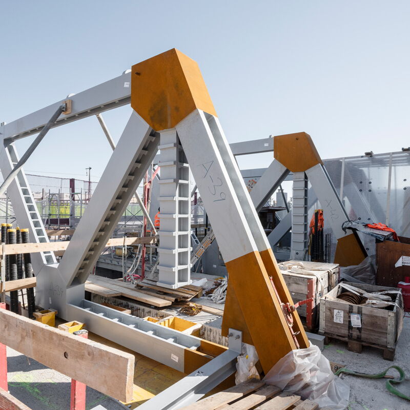 Das Tragwerk ist als Skelettbau mit vorfabrizierten Stützen und Ortbetonflachdecken konzipiert. Die Aussteifung gegen Wind- und Erdbebeneinwirkungen erfolgt über vertikal vorgespannte Aussteifungskerne. Im Bereich der Velorampe wird ein Ortbetonkern mittels 4 Vollstahlstützen abgefangen, in die Stützen eingeleitet werden die Kräfte mit einbetonierten Stahlfachwerken.