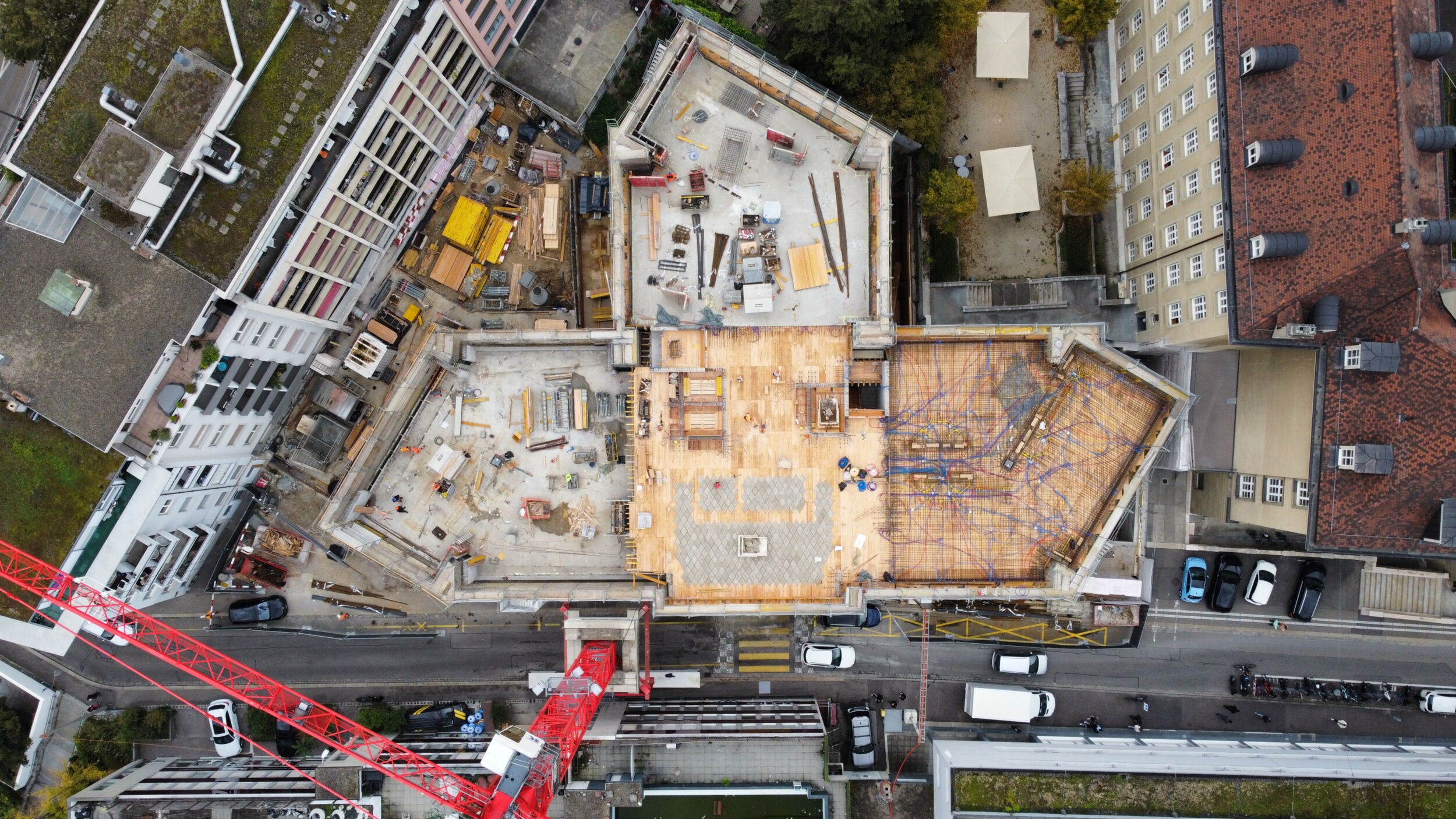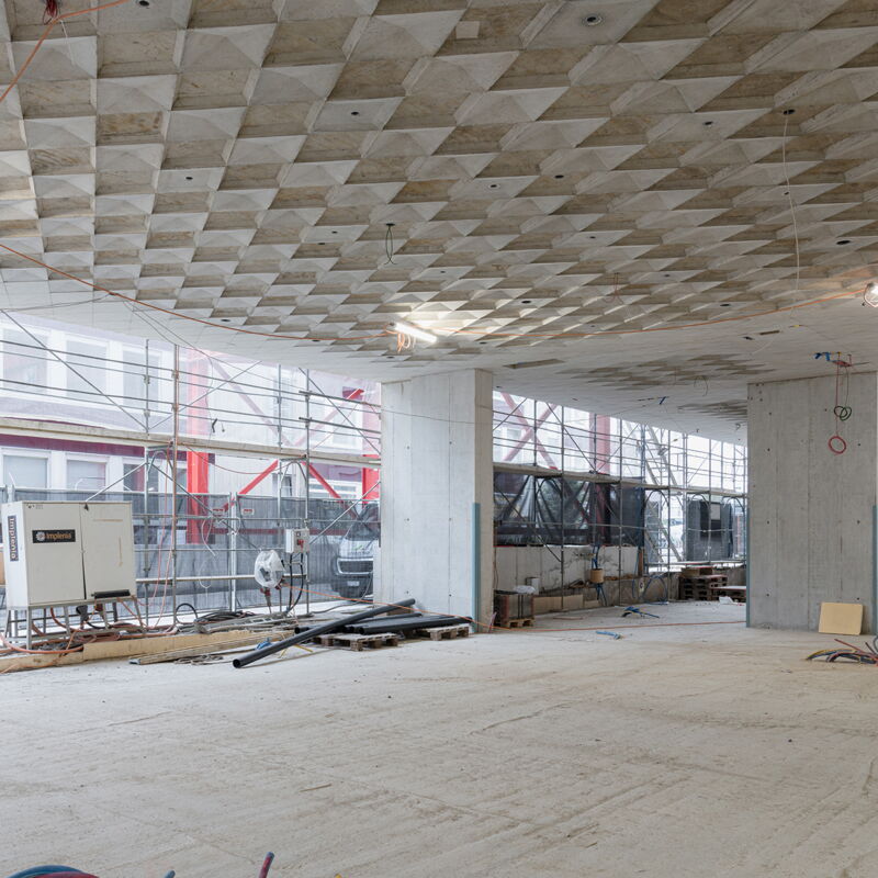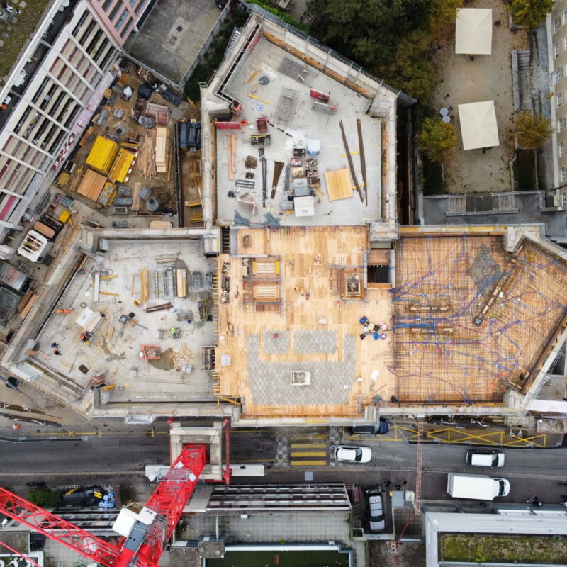 Phase 31 - 53: Mehrgeschossiges Gebäude in Massivbau, Akustikeinlagen in Sichtbetondecken, Baugrube mit Teilabbruch und Unterfangen best. Gebäude, Holzbau - Bearbeitung 2019 - 2023