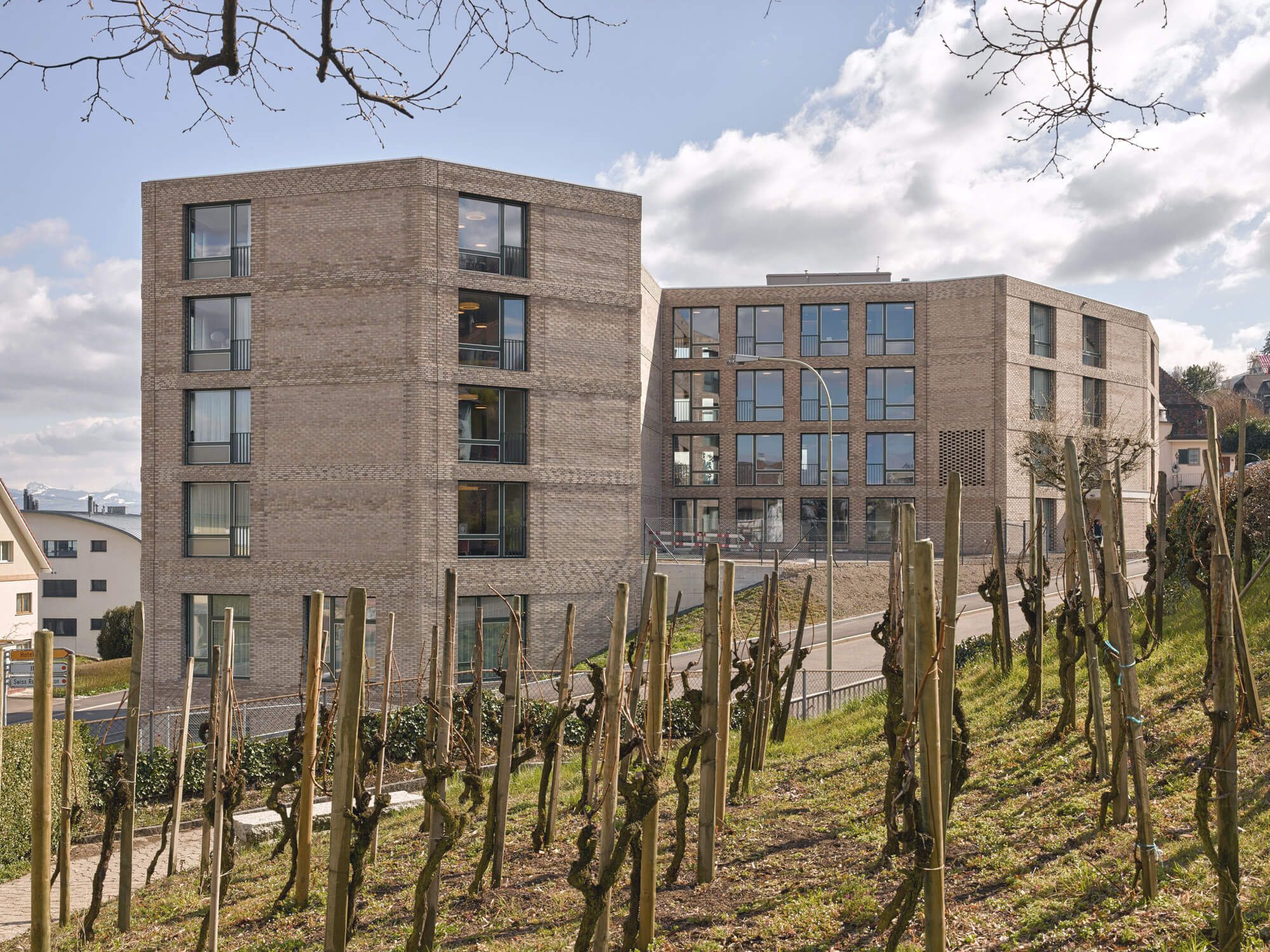 Die Tragstruktur des Gebäudes ist als nachhaltig umnutzbarer Skelettbau konzipiert. Dabei werden die Ortbeton-flachdecken lediglich von den Innen- und Fassadenstützen, den hangseitigen Wänden in Backstein bzw. Ortbeton sowie den Kernen der Vertikalerschliessung getragen.