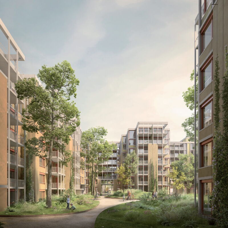Die Wohnsiedlung im Dreieck von Flüela‑, Fuchsia‑ und Dennlerstrasse wird in eine dichtere, städtischere Struktur überführt, in der Bestandsbauten und Neubauten ein gemeinsames architektonisches Gefüge bilden. Wohnen bleibt die prägende Nutzung, ergänzt durch punktuelle Gewerbeflächen und klar gefasste Freiräume, die das heute wenig strukturierte Areal in attraktive Stadträume gliedern.
