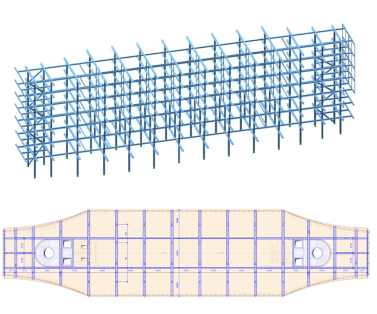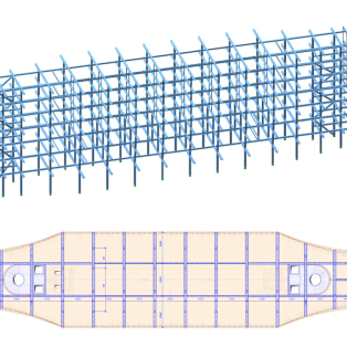 Die Aussteifung des Baukörpers wird in Gebäude-Querrichtung über beigesteife Stahlrahmen bewerkstelligt. In Gebäude-Längsrichtung sorgen zwei Fachwerkscheiben für die Stabilisierung des Tragwerks.