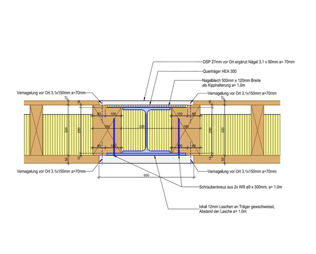 In der Deckenebene wird als primäre Struktur ein Stahlträger-Rost erstellt. Dieser bildet das Auflager für die sekundäre Struktur, welche aus Holz-Hohlkastenelementen besteht. Die Holzelemente tragen die Last in Gebäudelängsrichtung ab und wirken als zwischen die Stahlträger gehängte Einfeldträger. Durch Aufdopplung eines zusätzlichen, seitlich überstehenden Unterflansches an der Trägerunterseite können die Stahlträger als deckengleiches Auflager wirken. Sämtliche Aussenwände und Brüstungsbänder werden in Holzelementbauweise ausgeführt. Die beiden Treppenhäuser mit ihren geschwungenen Läufen sowie die Liftschächte werden als selbsttragende Stahlkonstruktionen ausgeführt.