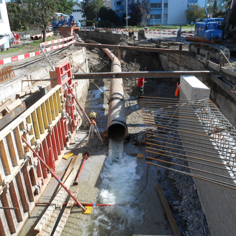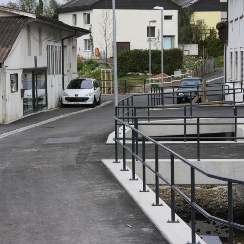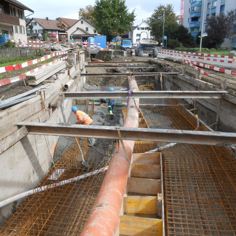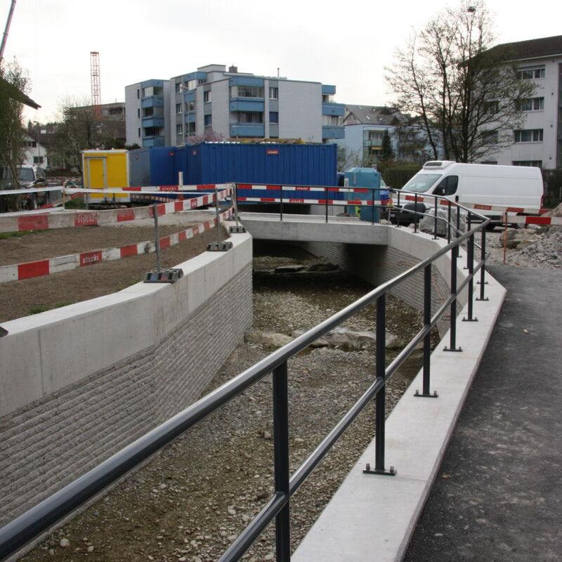 Durch die Verbreiterung des Bachprofils mussten die Werkleitungen für EW, Wasser, Swisscom und Cablecom vollständig umgelegt und neu erstellt werden.