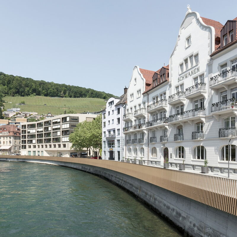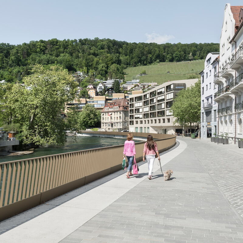 Gegen die Limmat wird die Promenade mit einem eleganten Staketengeländer abgeschlossen. Das Geländer wird so ausgebildet, dass ein Fussblech als Schutz gegen das 100-jährliche Hochwasser dient. Zusätzlich kann mit einem mobilen Hochwasserschutz, der im Ereignisfall am Geländer montiert werden kann, die Schutzhöhe vergrössert werden. Die Oberflächen der Badstrasse werden mittels Natursteinen und Betonplatten neu materialisiert. Der Baubereich liegt teilweise im Thermenschutzbereich 1.