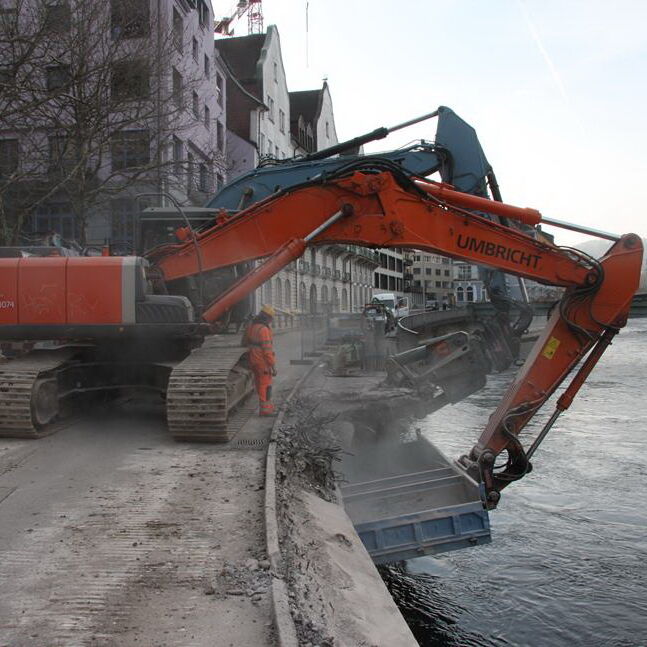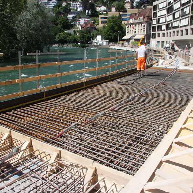 Die bestehende Auskragung mit Erstellungsjahr 1922/1953 wurde vollständig sowie die Ufermauer und das Gegengewicht teilweise abgebrochen und durch eine neue Kragkonstruktion ersetzt. Die Neugestaltung der Auskragung sieht eine Anpassung der Geometrie an die vom Flusslauf gegebene Rundung vor. Die Konstruktion ist in Stahlbeton ausgeführt. Die Lagerung erfolgt auf der bestehenden Ufermauer und teilweise dem gewachsenen Terrain hinter der Ufermauer. Die Auskragung wird mittels uferseitigen Gegengewichts gehalten.
