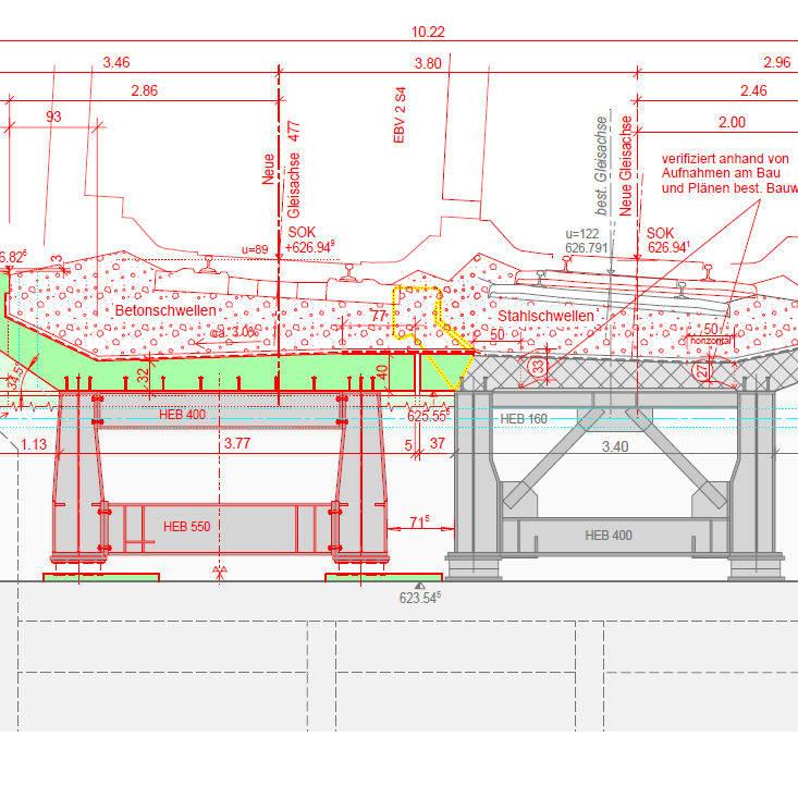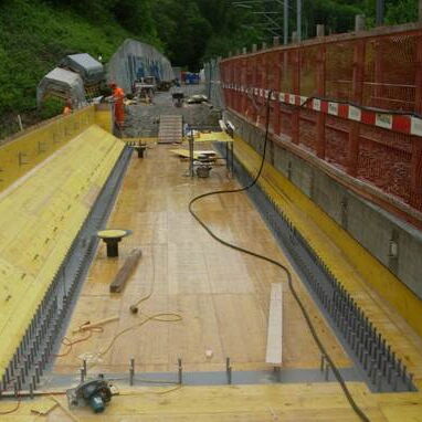 Anschliessend wurde die Betonplatte mit einer Längsdilatation direkt an die bestehende Brückenplatte betoniert, so dass ein durchgehender Schottertrog möglich wurde ohne die bestehende Brückenplatte übermässig stark in Querrichtung zu beanspruchen.