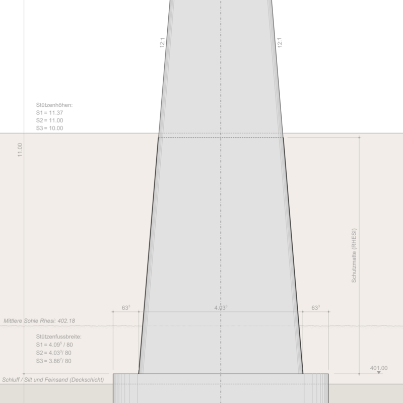 Für die neue Rheinquerung zwischen Au und Lustenau wurde eine Vierfeldkonstruktion mit einer Gesamtlänge von 286 m bei einer Feldeinteilung von 51.5 m / 72 m / 90.5 m / 72 m vorgeschlagen. Die Anordnung der Pfeiler wurde so gewählt, dass sowohl im Bestand mit den beiden Mittelwuhren als auch nach der Umsetzung des Renaturierungsprojekts RHESI ein ausgewogenes Gesamtbild entsteht. Die Konstruktion besteht aus einem untenliegenden Hohlkasten in wetterfestem Stahl. Die kontinuierliche Querschnittsveränderung entlang der Brücke erlaubt eine minimale Konstruktionshöhe im Bereich der Widerlager (65 cm), während im Bereich der grösseren Beanspruchungen die Höhe gegen Brückenmitte auf 212 cm anwächst. Dies ergibt eine schlanke und elegante Form der Brücke. Die Pfeiler sind unter Berücksichtigung der nach der Umsetzung RHESI zu erwartenden Kolktiefe flach fundiert.