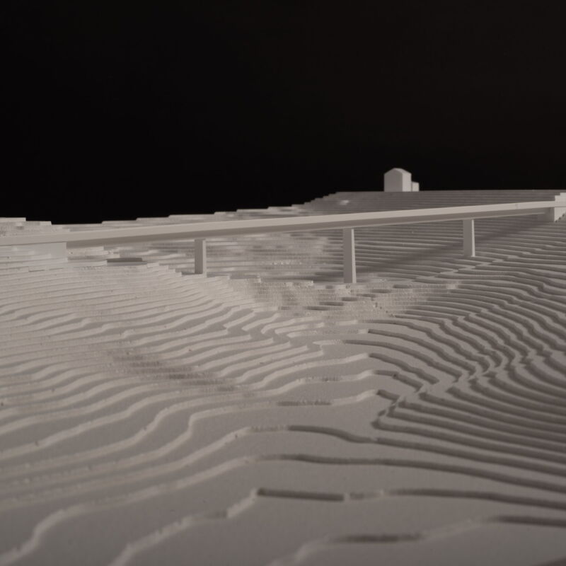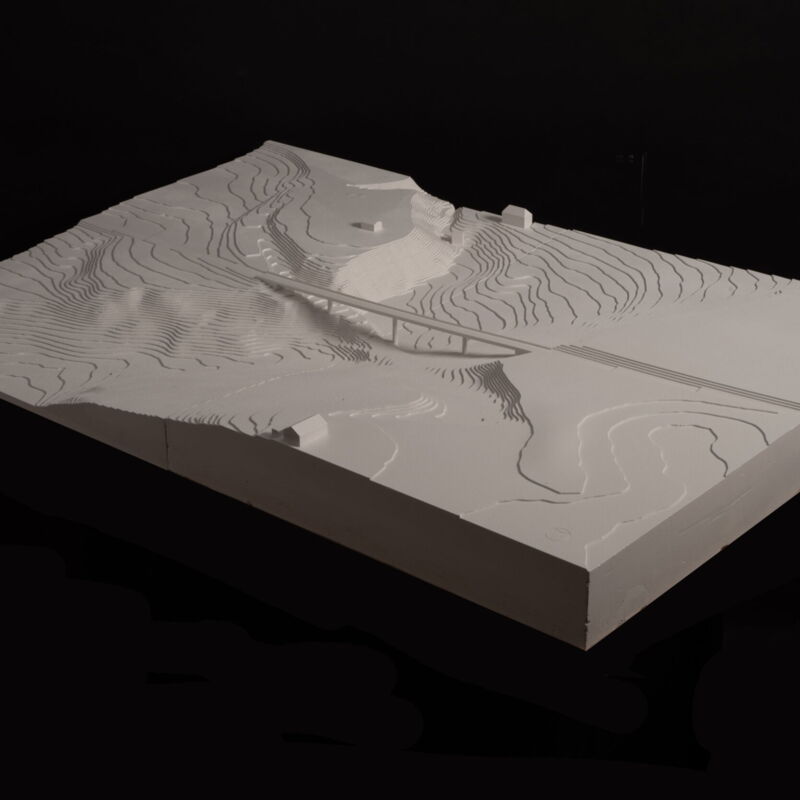 Ensuite, le choix de grandes portées donne au projet un aspect généreux et transparent. Il permet de placer chacune des piles à un endroit idéal. Leur implantation dans le terrain souligne leur position en se distançant de la route du Ferrâdzo avec son remblai artificiel au travers de la vallée.