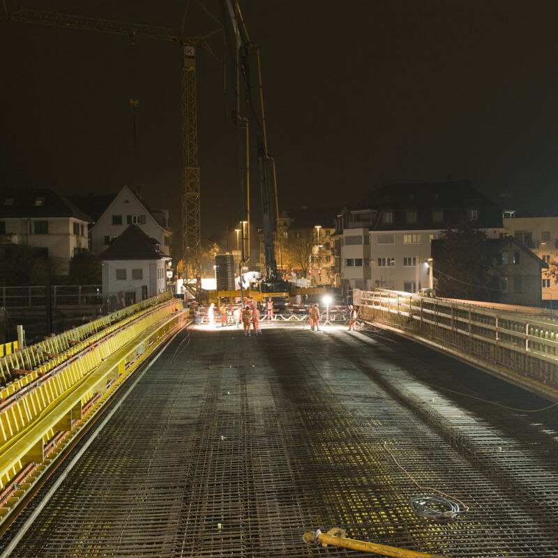 Die Einbindung der DML in Oerlikon bedingt eine völlig neue Gleisanlage von den Portalen Weinberg-/Wipkingertunnel bis und mit Bhf Oerlikon. Die Regensbergbrücke ist Teil der dadurch bedingten Baumassnahmen. Die neue Brücke ersetzt die alte Stahlbrücke. Sie dient heute dem Strassenverkehr, ist jedoch auch für eine zukünftige Tramlinie ausgelegt. Das Bauwerk wird als integrale, zweifeldrige Rahmenbrücke mit vorgespanntem Platten-balkenquerschnitt ausgebildet. Die Mittelstütze steht auf der Seitenwand des Unterquerungsbauwerks UBW (L= 510 m). Ohne Lager und Fahrbahnübergänge stellt die Brücke ein äusserst robustes und unterhaltsarmes Bau-werk dar. Aufgrund der minimalen lichten Höhe der bestehenden Brücke über den Gleisen (tw<5.20m/Fahr-draht < 5.00 m) musste der Abbruch minutiös geplant werden. Die Erstellung der neuen Brücke erfolgte unter engsten Platzverhältnissen bei vollständiger Aufrecht-erhaltung des Bahnbetriebes (6 Hauptlinien) und unter höchstem Termindruck, da der motorisierte Verkehr inkl. öV umgeleitet wurde. Daher wurde die Mittelstütze provisorisch auf Stahlprofilen fundiert, welche nach-träglich in die Seitenwand des UBW integriert wurden. Dadurch konnte die Brücke parallel zum UBW (7.5m tiefe Baugrube) erstellt werden. Besonders anspruchsvoll war auch die Umlegung der zahlreichen Werkleitungen. Architektonisch wird die Brücke in das übergeordnete Gestaltungskonzept eingebettet. Die transparenten Lärmschutzwände der Anschlussstützmauern werden auf den Brüstungen der Brücke weitergeführt, als Abtrennung zum Gleisraum (inkl. Berührungsschutz).