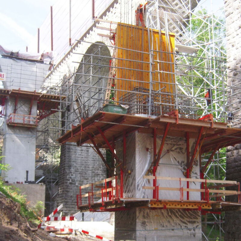 Die Erstellung der Brücke im steilen Gelände und unter Aufrechterhaltung des Bahnbetriebes verlangte bereits in frühen Projektphasen eine detaillierte Überprüfung von Bauverfahren und Installationskonzepten. Unter stark eingeschränkten Zugangsmöglichkeiten wurden die massiven Pfeilerfundamente im Tobel erstellt. Dafür mussten entsprechend tief ins steile Gelände eingreifende Baugruben (mit rückverankerten Wänden) erstellt werden.
