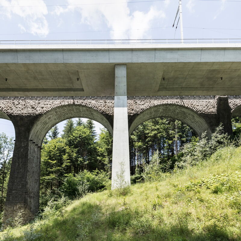 Trotz zahlreicher komplexer Projektvorgaben aufgrund des steilen Geländeverlaufs, des unmittelbar daneben liegenden, bestehenden Bauwerks und den bei Bahnbrücken grossen Beanspruchungen konnten konstruktiv und ästhetisch optimale Lösungen gefunden werden. Der gestalterische Anspruch liegt dabei im harmonischen Zusammenwirken der beiden Bauwerke trotz ihrer grundverschiedenen Bauart (Naturstein/Beton bzw. Bogen/gerade Linien).