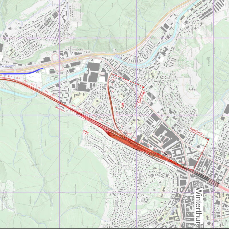 - Die Überwerfung Neumühle mit einer Länge von 600 m sowie 230 m Rampen , welche im Bereich Tössmühle drei Durchgangsgleise überquert. Total 11 Felder zwischen 40m und 65.10 m.