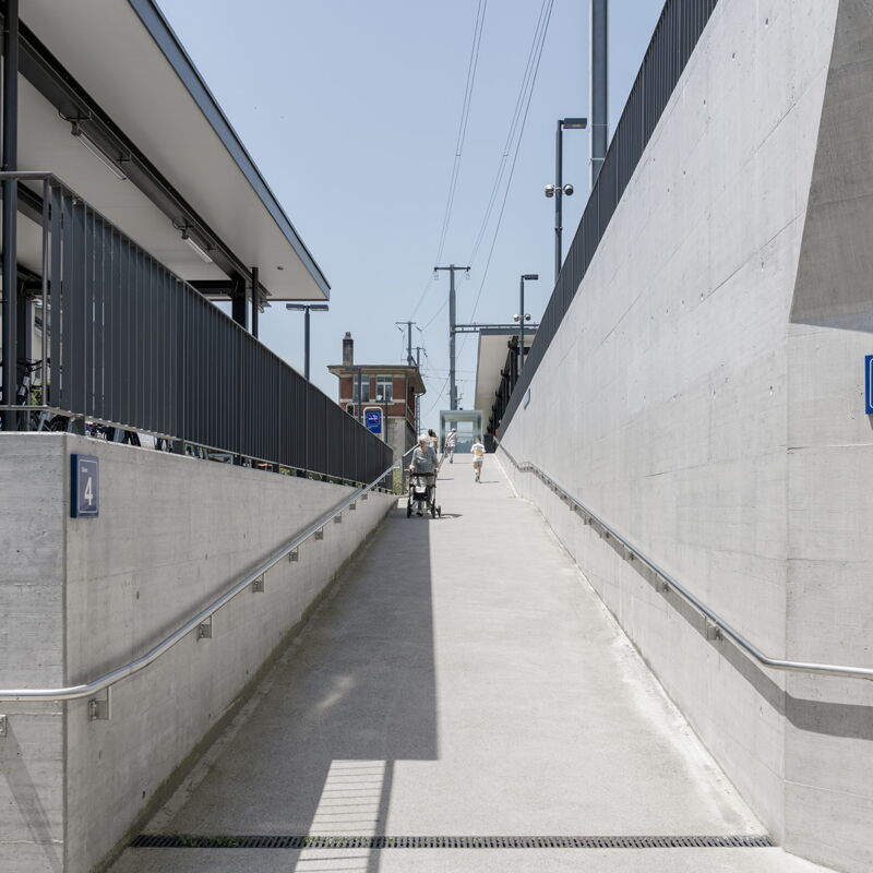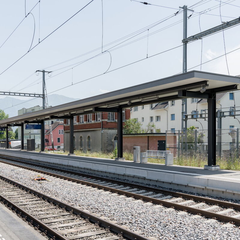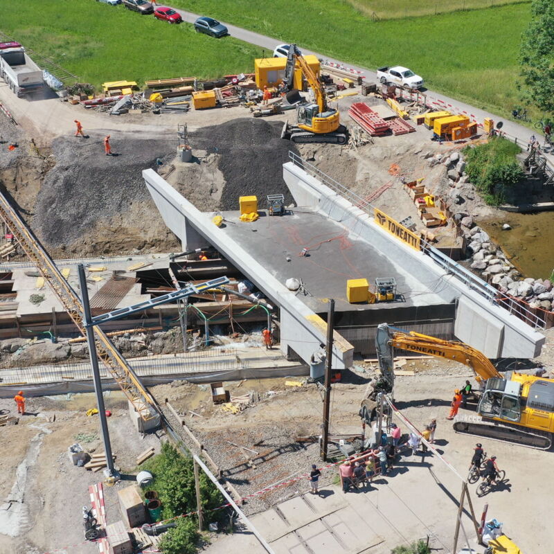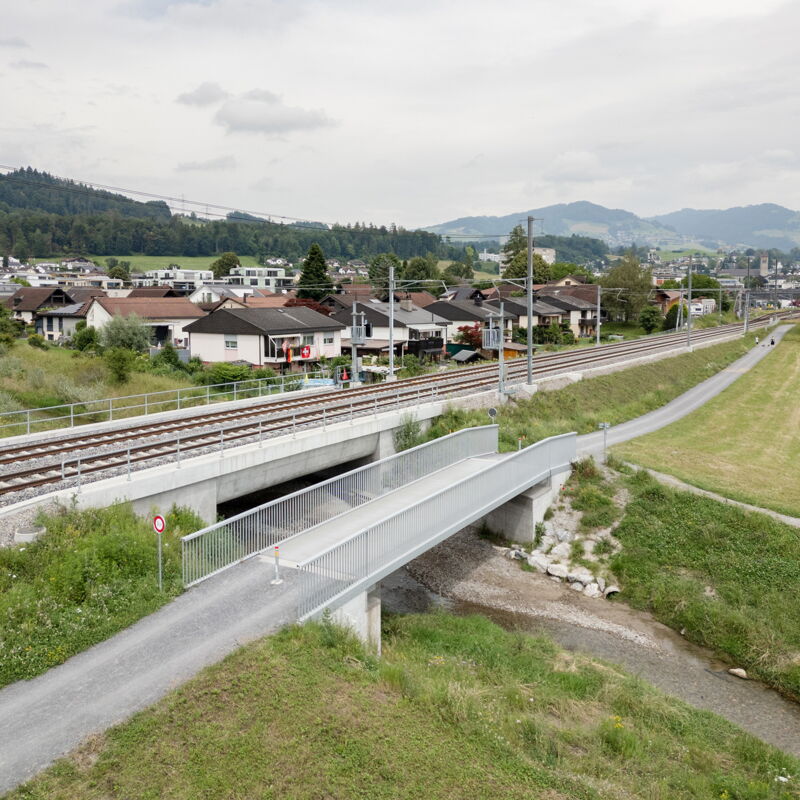 Neubau zweier Dächer im Bahnhof Uznach für Perron, Rampe und Kundencenter. Anpassung PU, Neubau Rampe. Brücken Aabach und Ernetschwilerbach: Aufgrund der Geometrie und des Alters der bestehenden Brücken und der ungenügenden Hochwassersicherheit ist ein Totalersatz notwendig. Der Neubau ist als schlaff bewehrter, schiefer Ortsbetonrahmen konzipiert. Die Fundation erfolgt mit Bohrpfählen, welche schwimmend in den Deltaablagerungen gelagert sind. Die Widerlager-wände, Flügelmauern und Brückenplatten der Bahn-brücken werden neben den bestehenden Brücken erstellt und in einer Wochenendsperre quer eingeschoben. Die Flügelmauern werden den geometrischen Gegebenheiten entsprechend parallel zur Gleisachse angeordnet. Die SOK wird um 42 bzw. 45 cm angehoben.