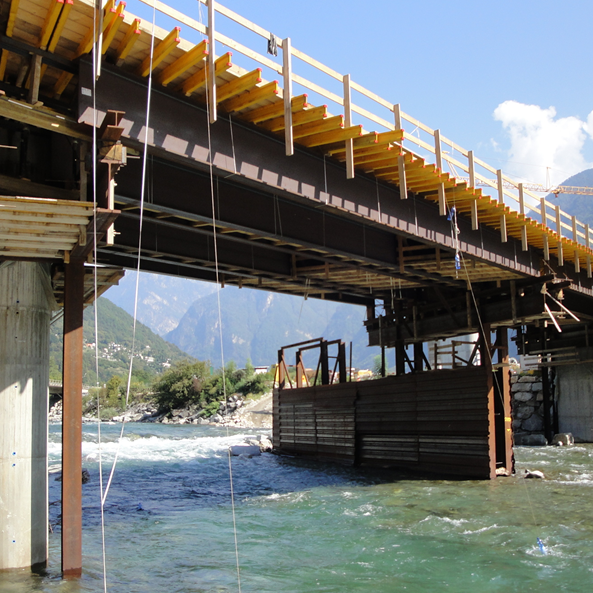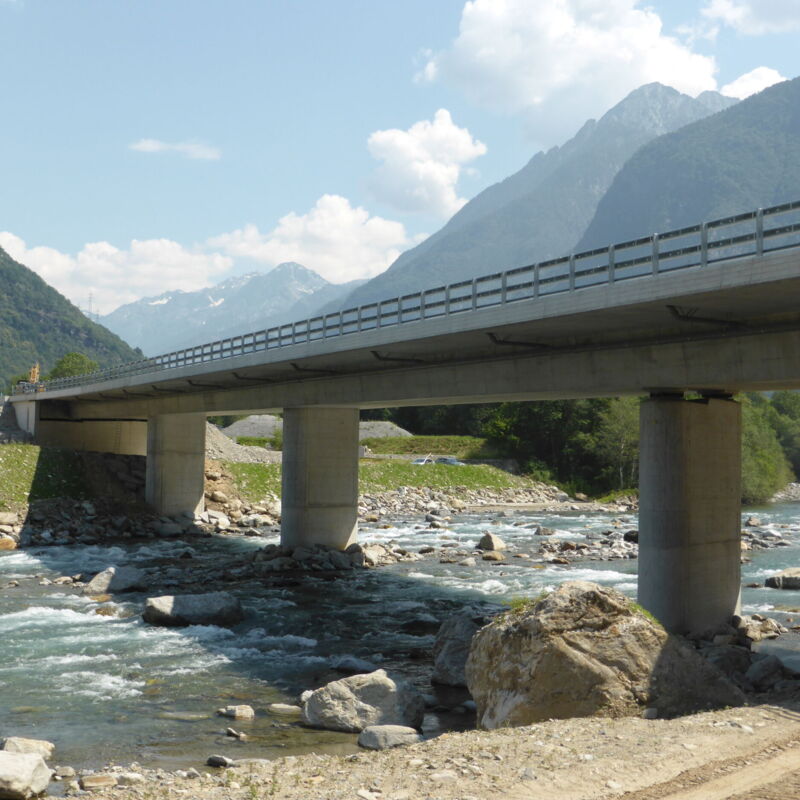 - Ponte Moesa Campagnola: Dreifeldrige Autobahn-zwillingsbrücke (2+2 Fahrstreifen) mit einer Gesamt-länge von 94 m. Leicht schiefe (ca. 30°), schwimmend gelagerte, vorgespannte Hohlkastenbrücke.