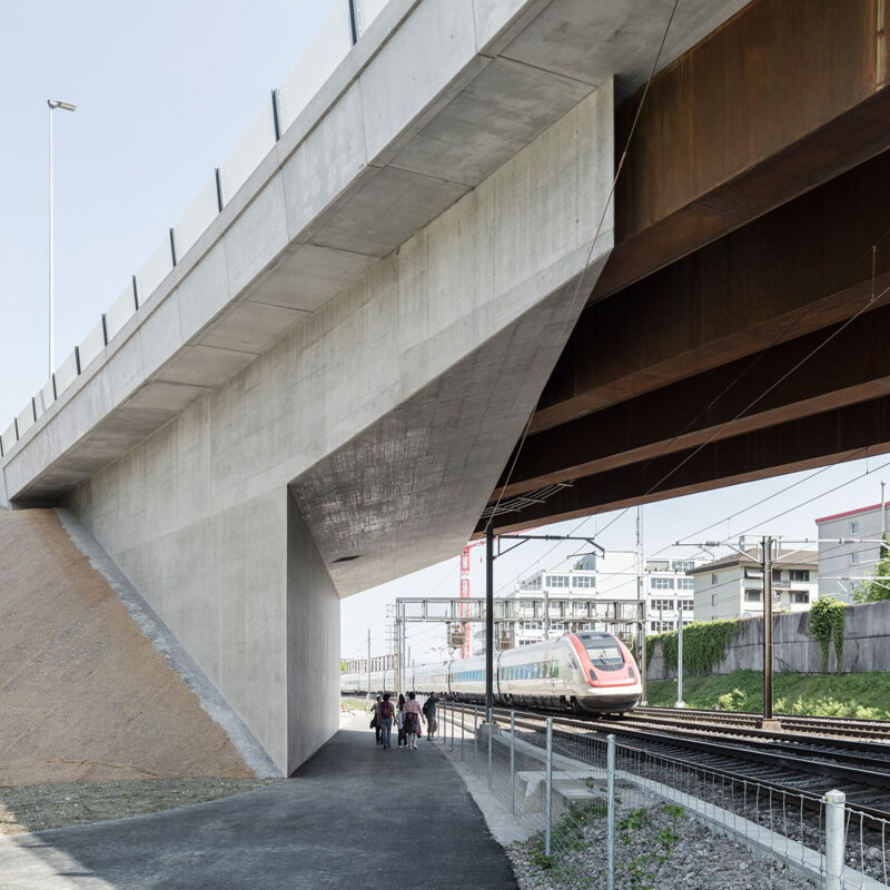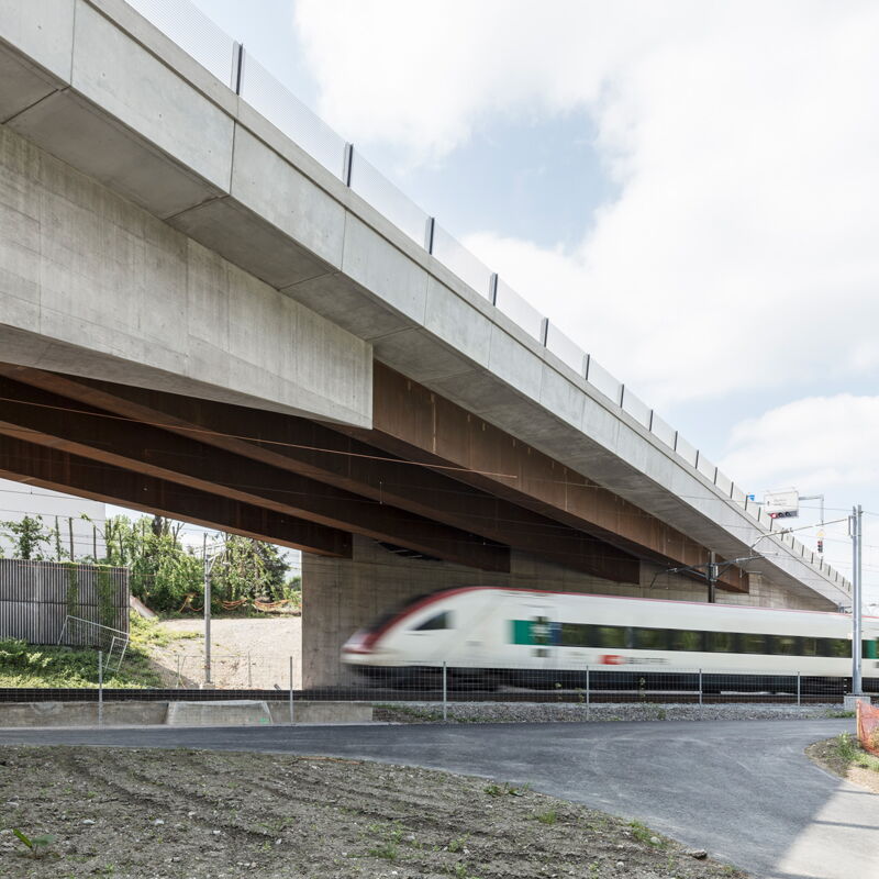Im Bahnbereich wird eine Stahl-Beton-Verbund-konstruktion eingesetzt. Vier Stahlkasten aus wetterfestem Stahl stellen die Haupttragelemente dar. Die da-rüber liegende Fahrbahnplatte, welche mit den Stahlträgern im Verbund wirkt, besteht aus Fertigbetonteilen, welche als verlorene Schalung eingesetzt und mit einer Ortsbetonschicht ergänzt werden. Die Randzone im Bereich über dem Geh- und Radweg wird in Spannbeton ausgebildet und mit der Verbundkonstruktion und der Widerlagerwand zu einem Rahmen verbunden.