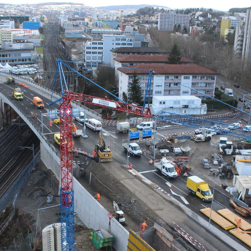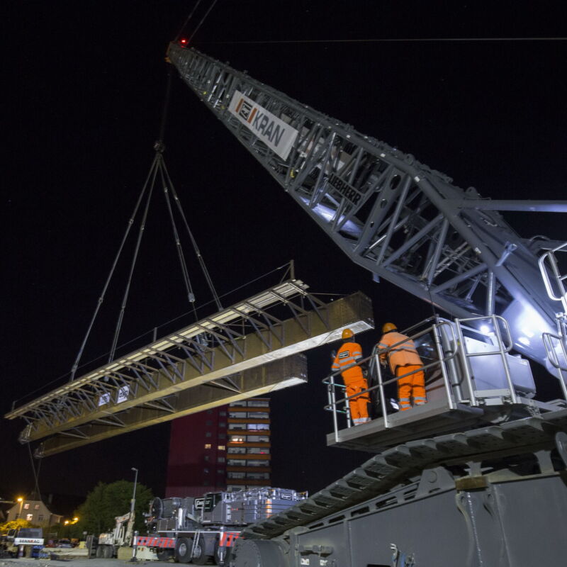 Der Abbruch der bestehenden Brücke (Stahlträgerrost) sowie das Einheben der neuen Brückenträger erfolgen mittels grosser Raupenkräne während einer Totalsperre der Bahnanlage.