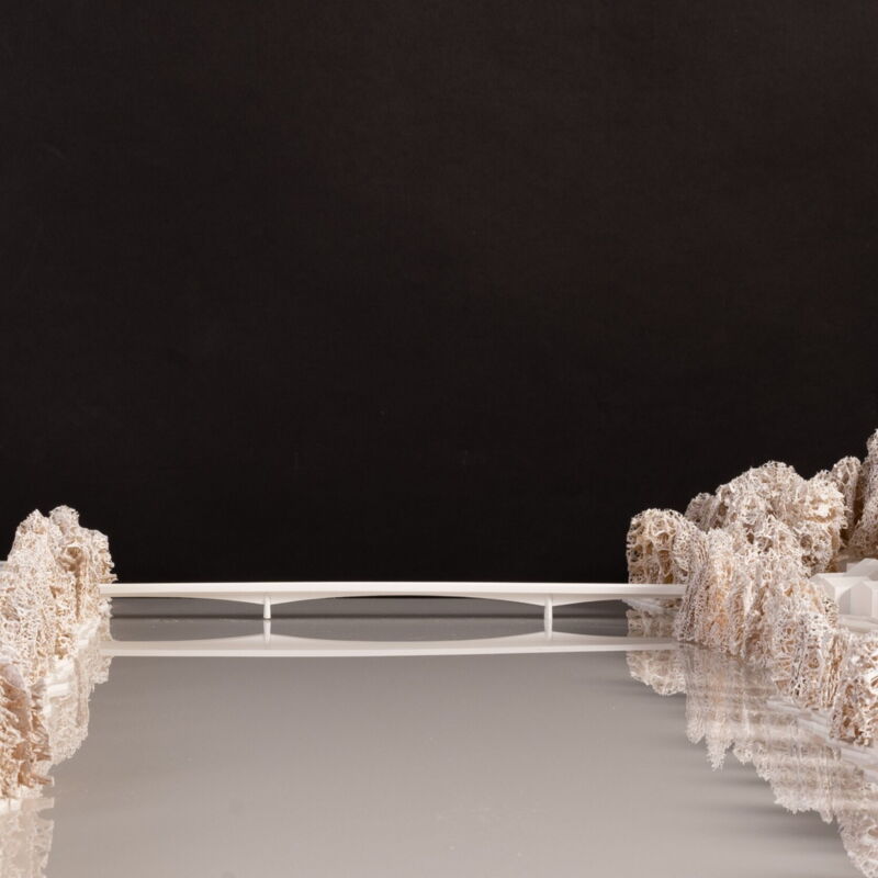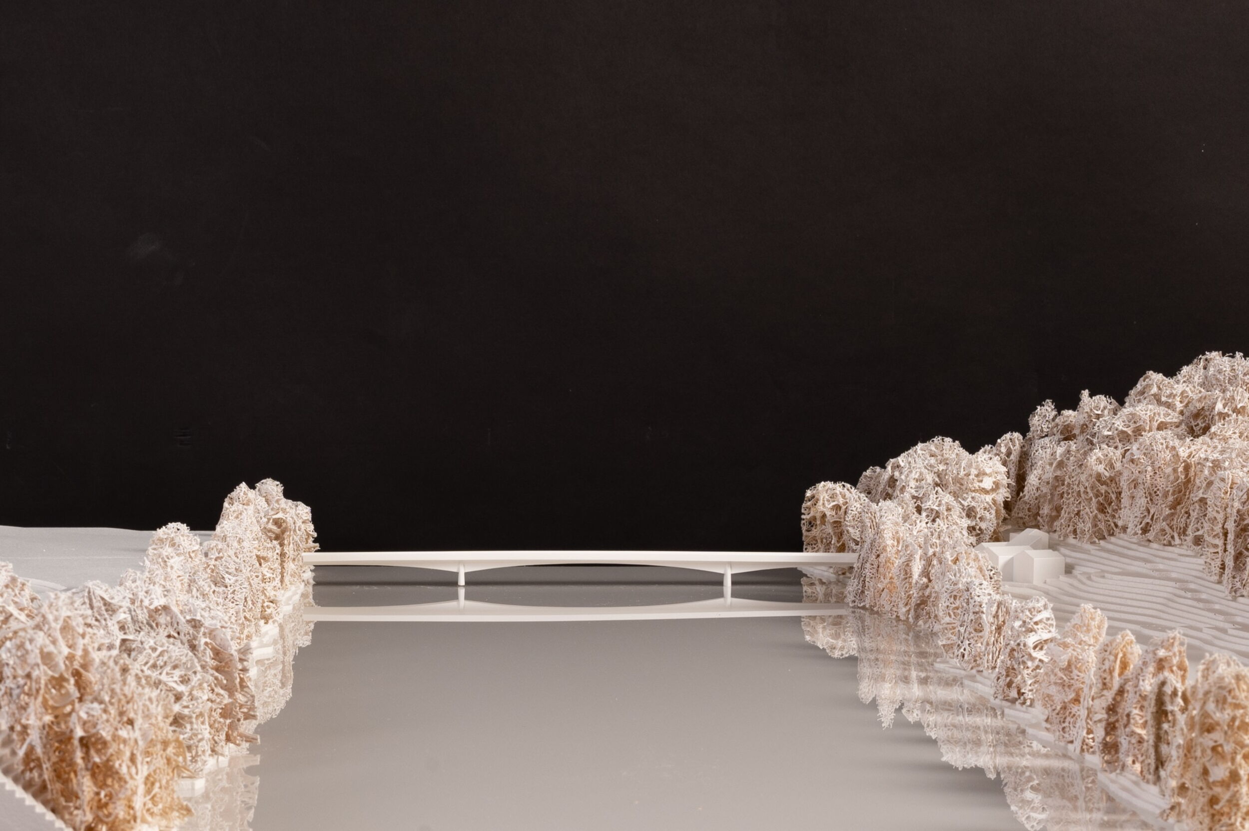 Die Umfahrungsstrasse wird unmittelbar nach der Flussquerung beidseitig in Tunnels verlegt, womit die Landschaft und das Siedlungsgebiet nicht unnötig belastet wird. Die Einfachheit der Brücke hat zum Ziel, die sehr wertvolle Landschaft zu stärken und nicht sich selber in Szene zu setzen.