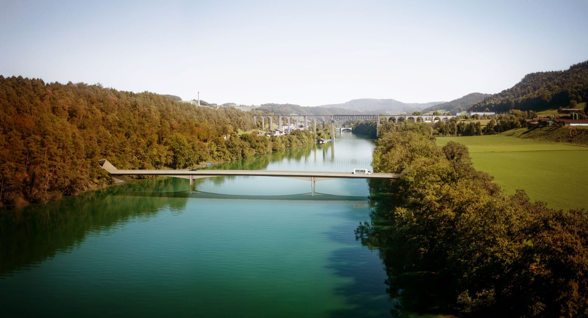 Angesichts der äusserst strengen Anforderungen in Bezug auf den Schutz der Flusslandschaft (BLN-Gebiet) haben wir uns für eine sehr zurückhaltende Lösung entschieden, welche den Flussraum bestmöglich schont. Die Linienführung wurde von uns derart gewählt, dass die Brücke lediglich von Ufer zu Ufer quert - die natürliche Lage.