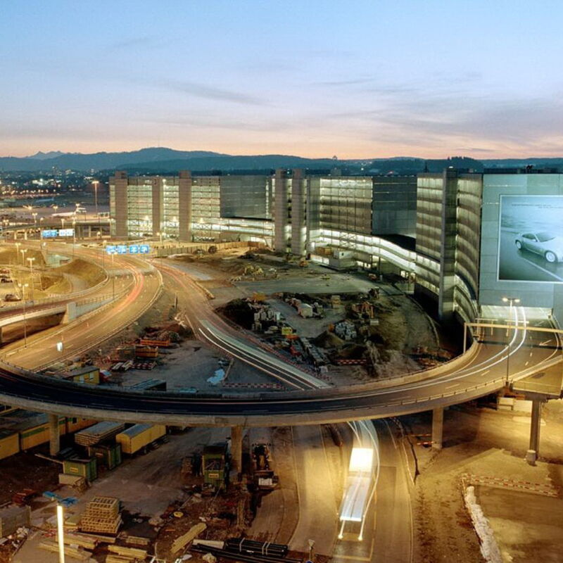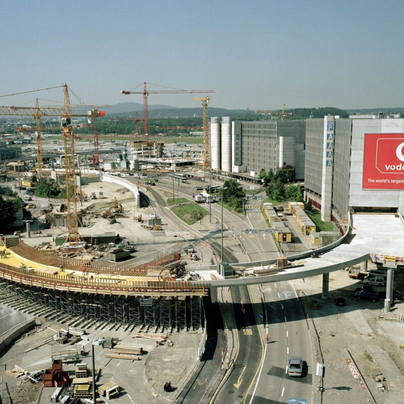 dsp bearbeitete innerhalb der IG für den landseitigen Verkehrsanschluss des Flughafens Zürich im Rahmen der 5. Ausbauetappe die Kunstbauten. Dazu gehören diverse Stützkonstruktionen, Unterführungen für Fussgänger, einfachere Strassenbrückenobjekte, aber auch geometrisch sehr anspruchsvolle Brückenobjekte, wie beispielsweise die Spinnenbrücke mit diversen Ästen als Zu- und Wegfahrtbauwerk zu den Parkhäusern und zu den Terminals. Diese weist eine Gesamtfläche von über 4’000 m2 auf.