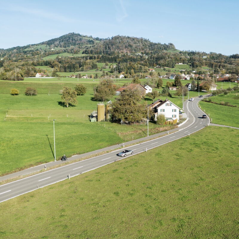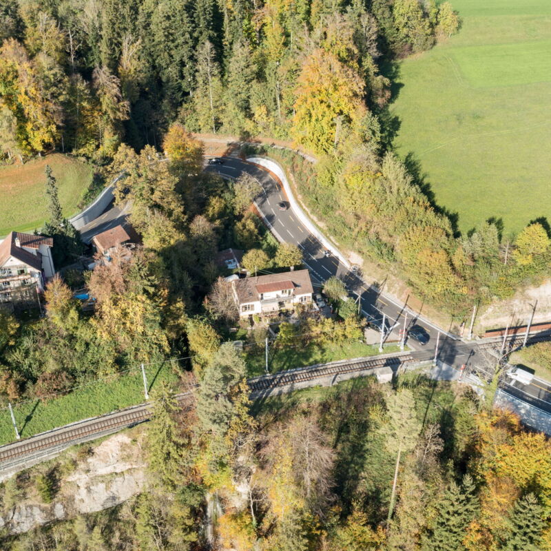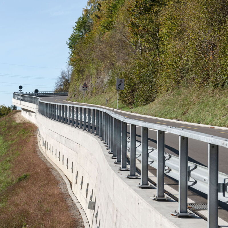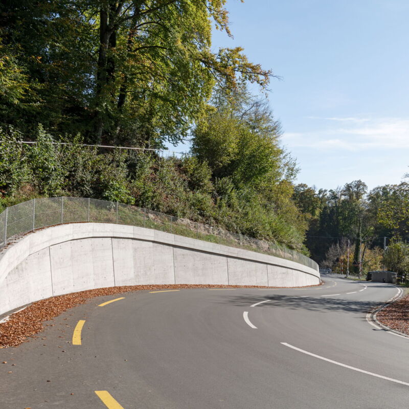 - Auskragende Stützwandkonstruktion Pilgersteg zur Strassenverbreiterung, L = 220 m, Gründung mittels im Molassefels eingebundenen Bohrpfählen, rückverankert mit vorgespannten Ankern