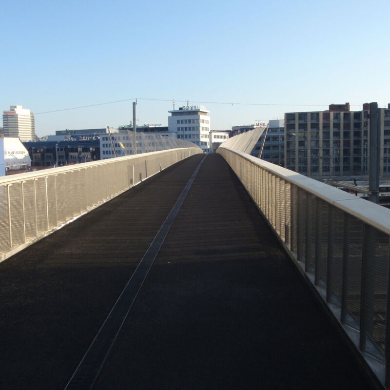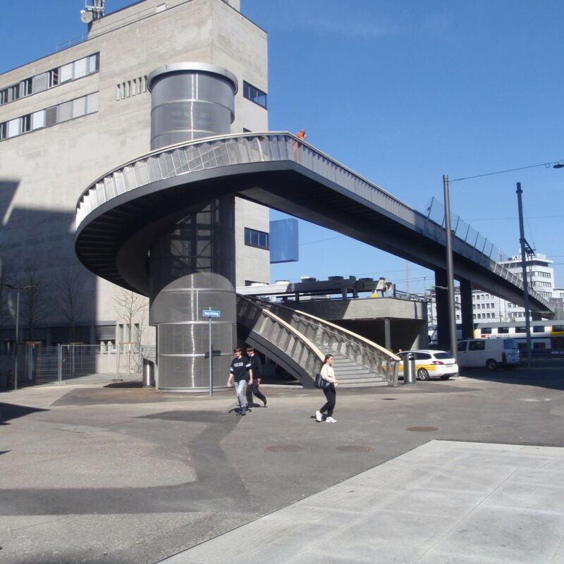 Der tragende Querschnitt besteht aus einem Hohlkasten mit variabler Höhe und seitlichen Konsolen mit konstanter Auskragung als orthotrope Platte. Die Brücke wird primär von vier Stützen getragen, welche auf den bestehenden Wänden der Rampen in die beiden Tiefbahnhöfe stehen. Die spiralförmigen Treppenaufgänge werden als Verlängerung der Brückenkonstruktion um die beiden Lifttürme fortgeführt und sind als Kastenträger mit einseitiger Auskragung ausgebildet.